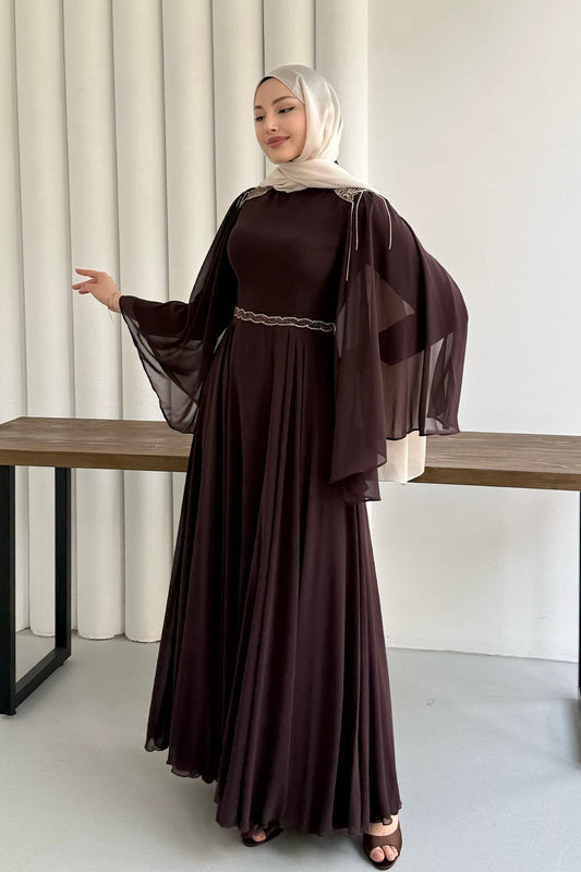 Lüks Taş İşlemeli Pelerin Kollu Tesettür Abiye kahve