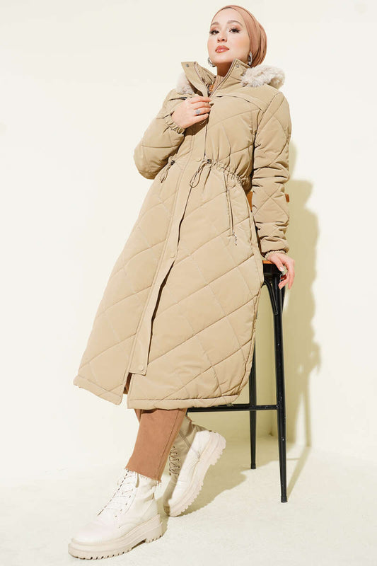 Kürk Kapüşonlu Kapitone Uzun Mont bej