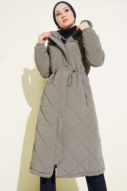 Bel Tünelli Kapüşonlu Kapitone Mont taş