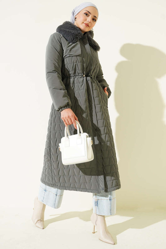 Kürk Kapüşonlu Kapitone Uzun Mont gri