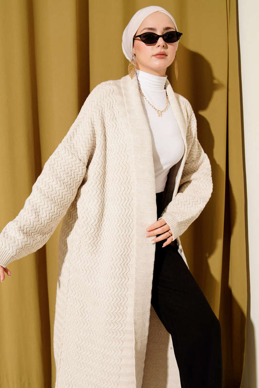 Zigzag Kabartmalı Triko Uzun Hırka ekru