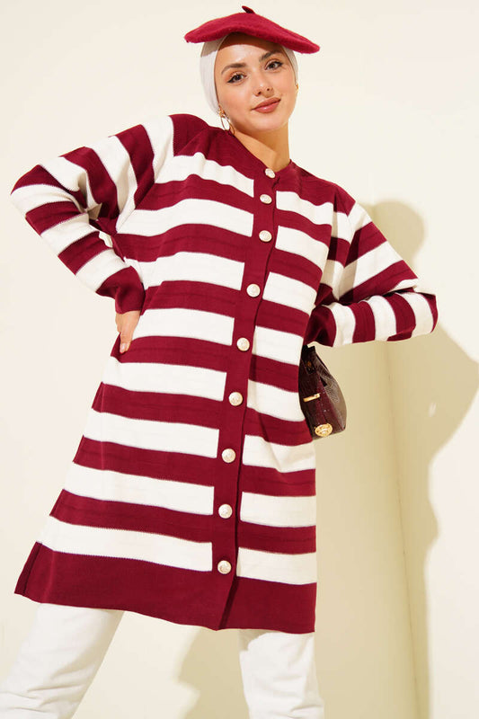 V Yaka Fitilli Çizgili Triko Tunik Bordo