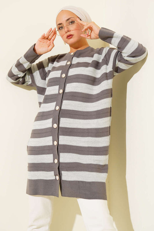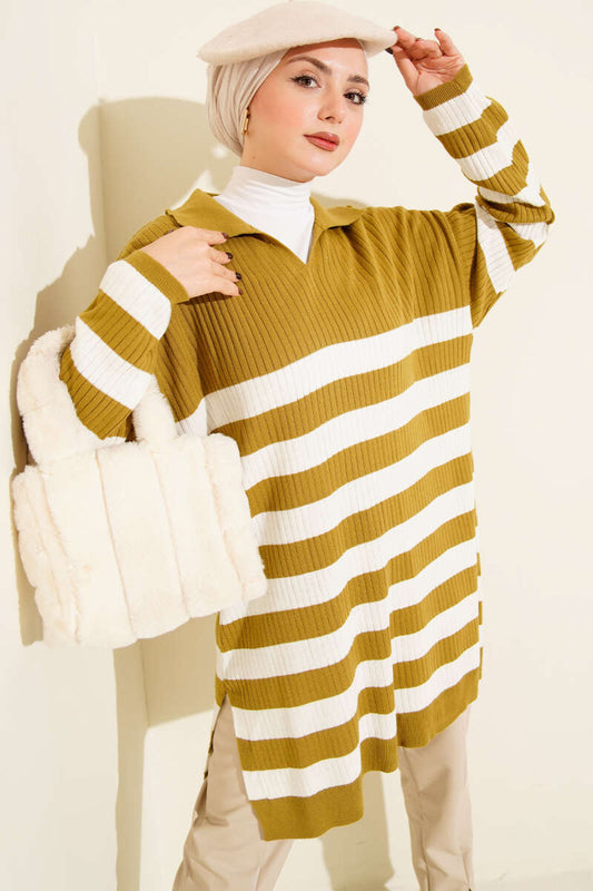 V Yaka Fitilli Çizgili Triko Tunik yağ yeşili