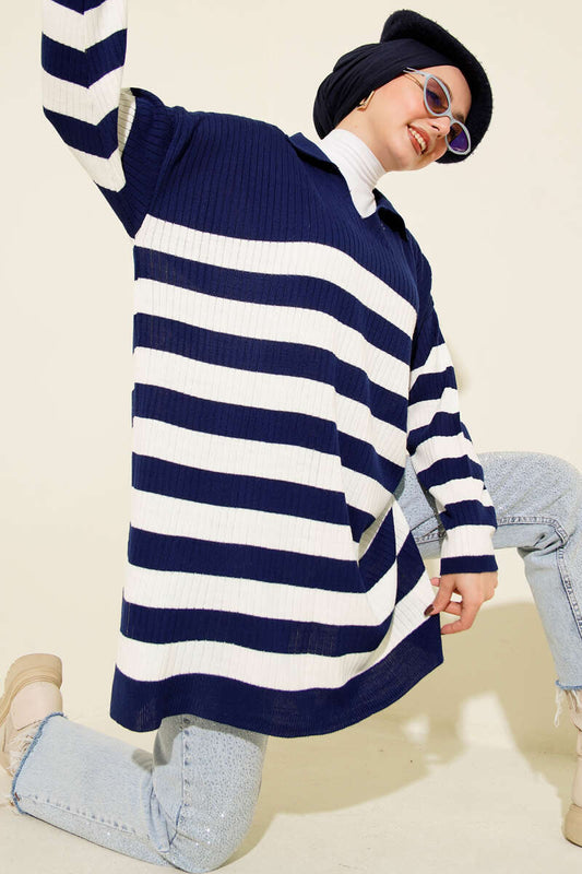 V Yaka Fitilli Çizgili Triko Tunik Lacivert