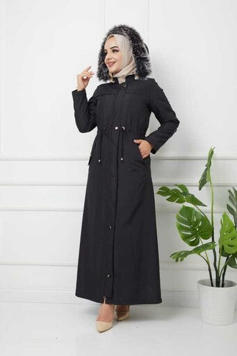 Beli Büzgülü İçi Yün Uzun Mont Siyah