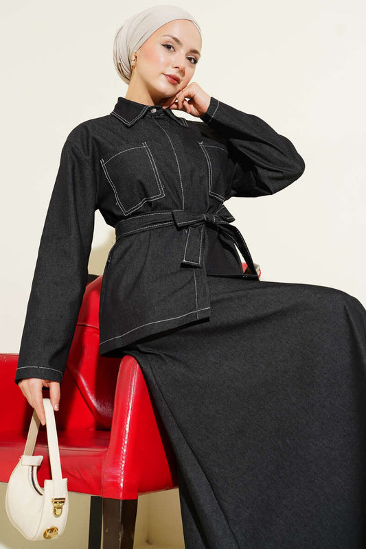 Çift Cepli Kuşaklı Etekli Kot İkili Takım siyah