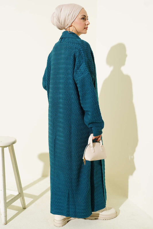 Zigzag Kabartmalı Triko Uzun Hırka petrol mavi