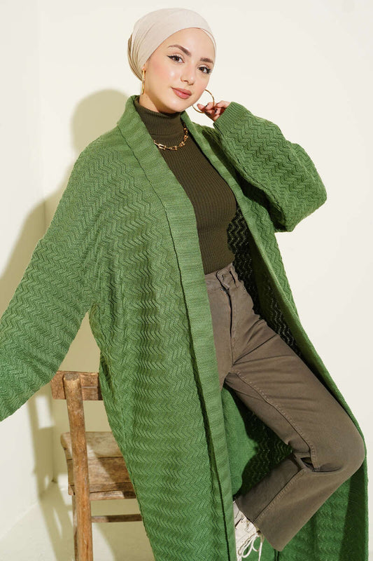 Zigzag Kabartmalı Triko Uzun Hırka yesil