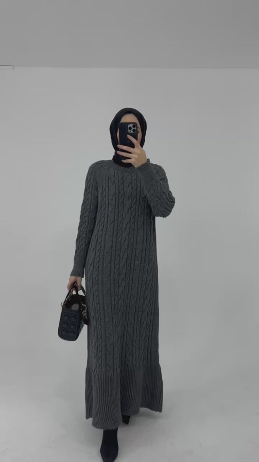 Beli Kuşaklı Uzun Tesettür Elbise - gri