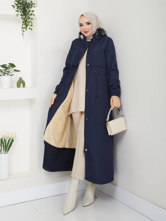 Kürk Kapşonlu Uzun Şişme Mont - Lacivert