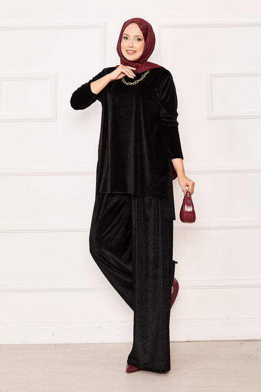 Önü Asimetrik Detaylı Kadife Takım siyah