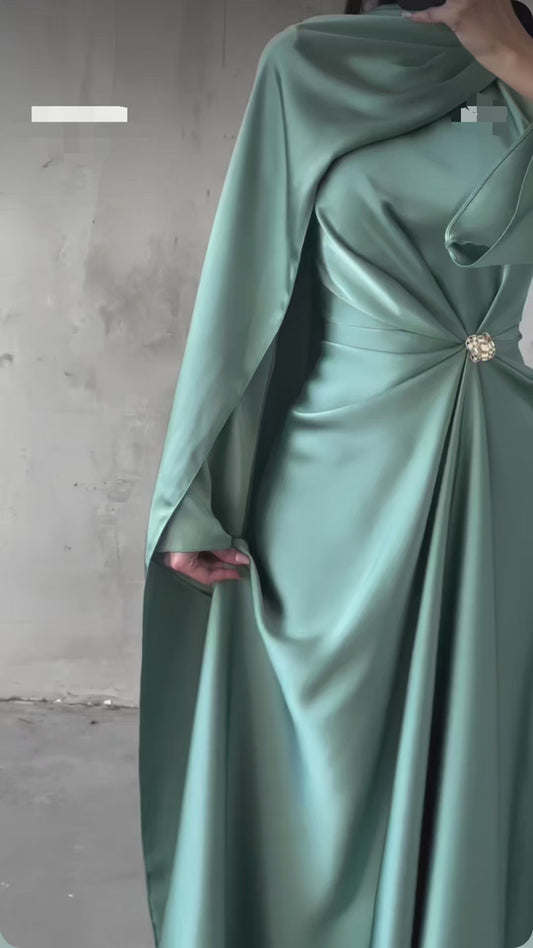 Broş Detaylı Saten Abiye mint yeşili