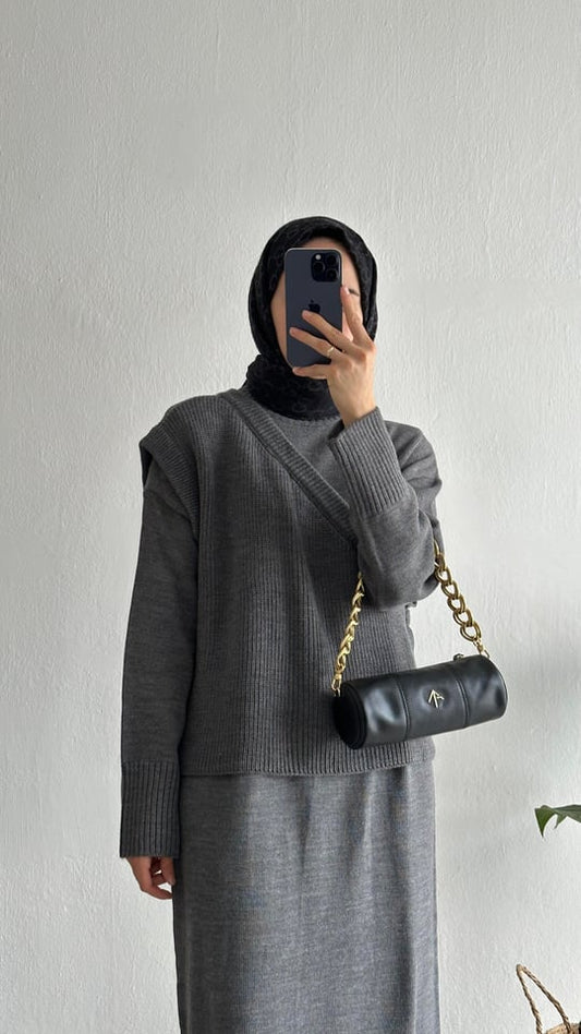 Zweiteiliges Strickset mit Weste und Kleid grau