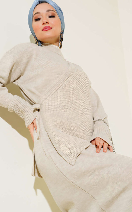 Strick-Zweiteiler mit Weste und Kleid in Visonfarbe