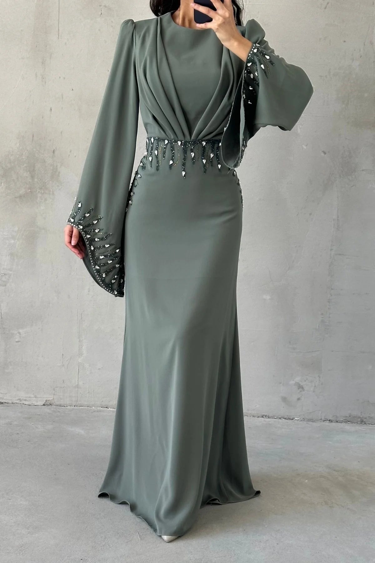 Adriyana kumaşın zarif duruşu ve ince işçiliğiyle tasarlanan bu tesettür abiye, özel günlerinizde şıklığınızı taçlandırıyor. Bel ve kol detaylarındaki göz alıcı taş işlemeler asil bir ışıltı katarken, dökümlü üst tasarımı feminen bir zarafet sunuyor. Davetler, nişan ve düğünlerde modern ve şık görünmek isteyenler için ideal bir seçim.Mankenimiz en küçük bedeni giymektedir: