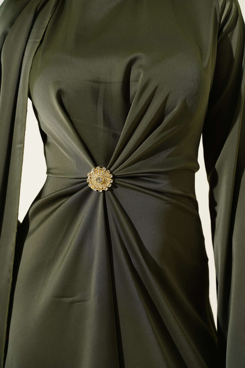 Bel Büzgü Detaylı Saten Abiye Elbise haki