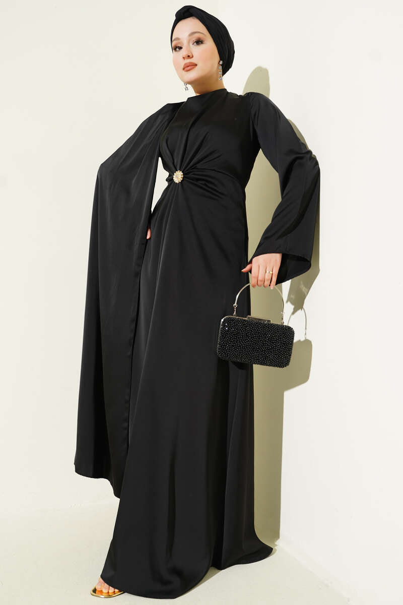 Bel Büzgü Detaylı Saten Abiye Elbise siyah