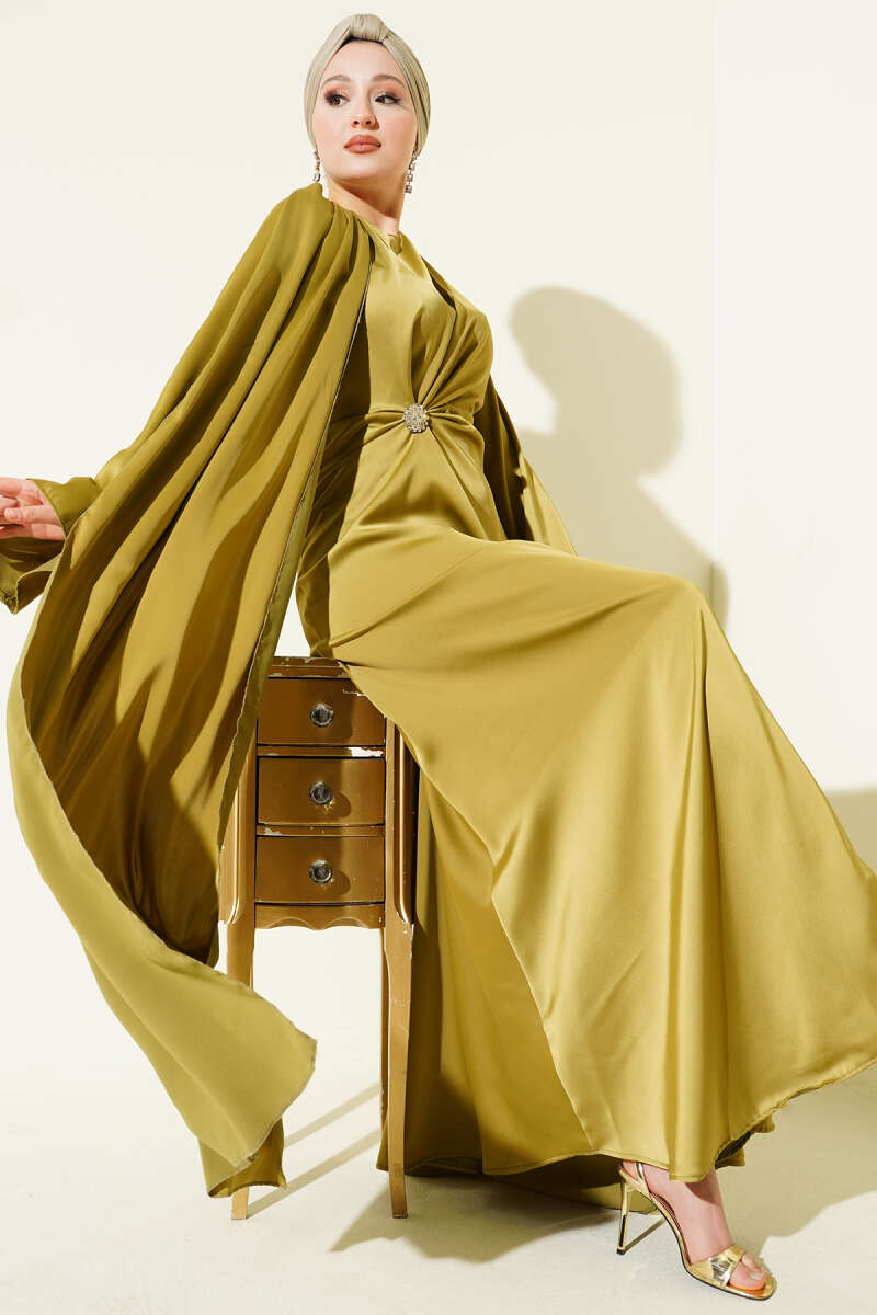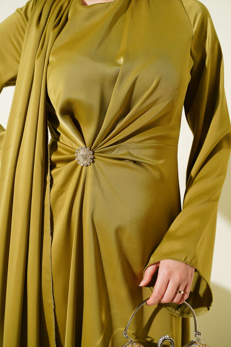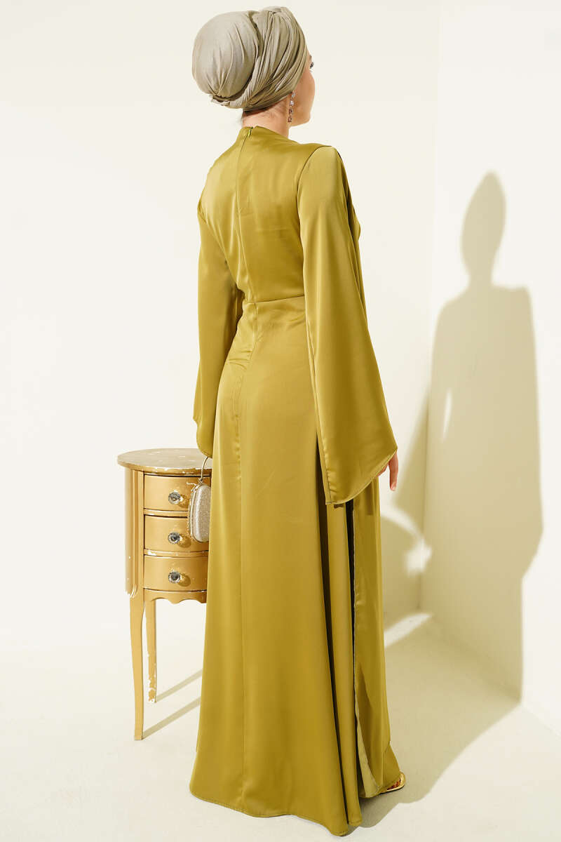 Bel Büzgü Detaylı Saten Abiye Elbise yağ yeşili
