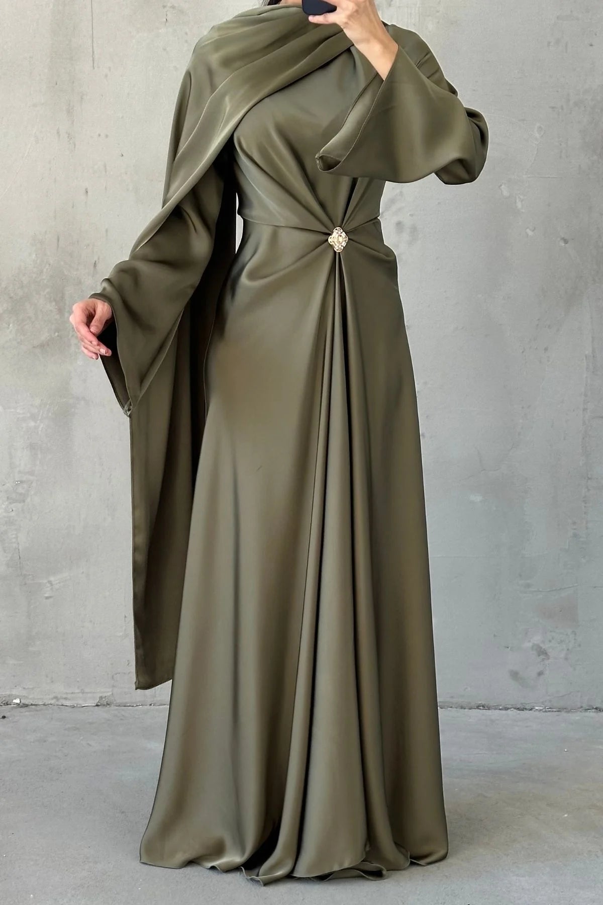 Broş Detaylı Saten Abiye haki