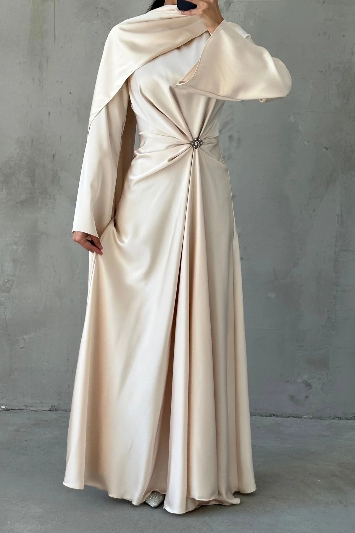 Akıcı saten kumaşı, bel kısmındaki zarif drape ve taş detaylı tokasıyla şıklığı ön plana çıkarır. Geniş kolları ve dökümlü tasarımıyla asil bir duruş sunan bu abiye; söz, nişan, davet ve tüm özel günlerinizde zarafetinizi yansıtacak ideal bir seçimdir.Mankenimiz en küçük bedeni giymektedir.