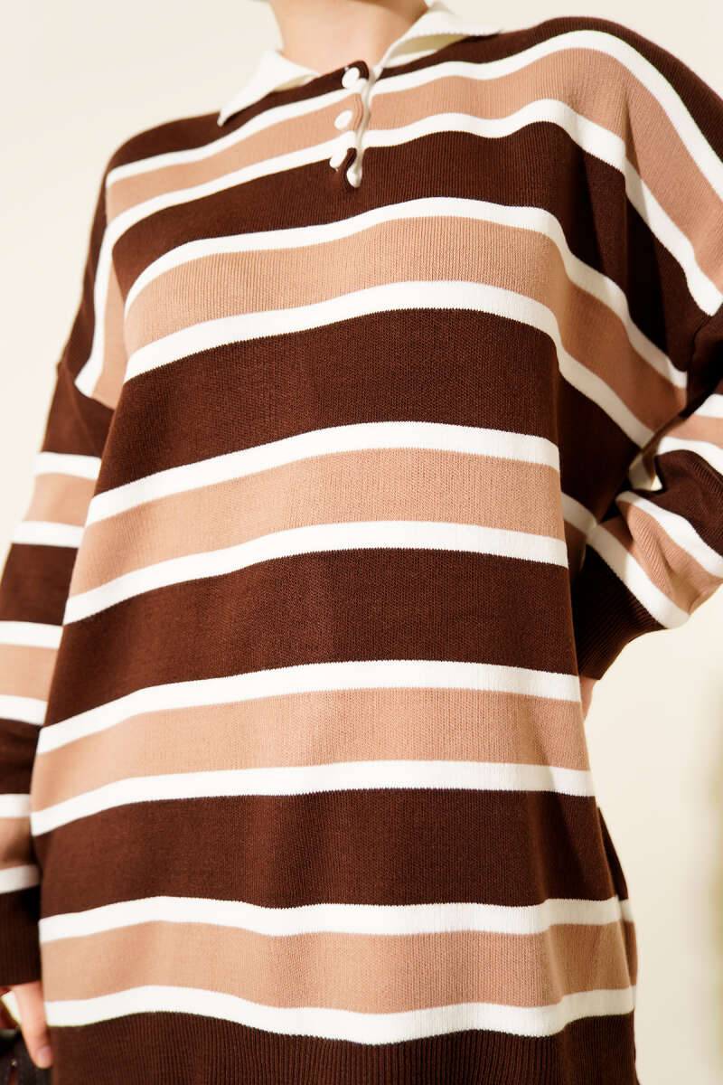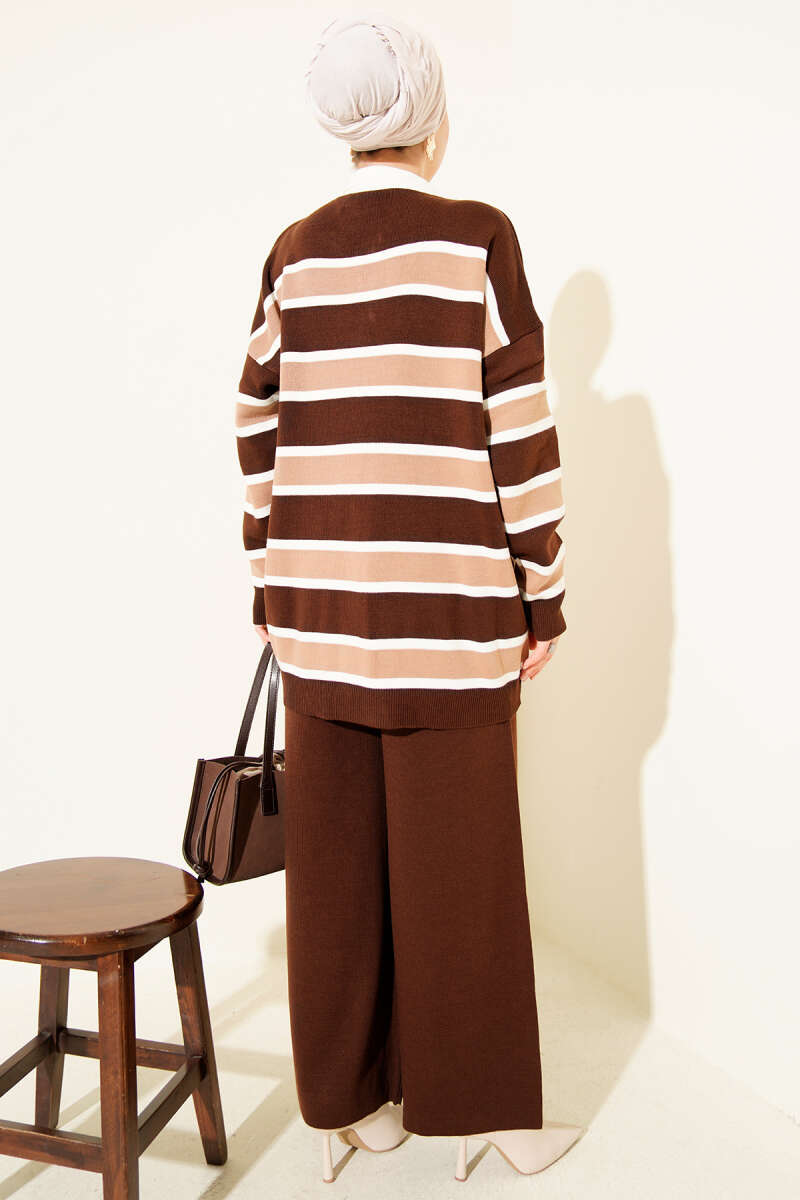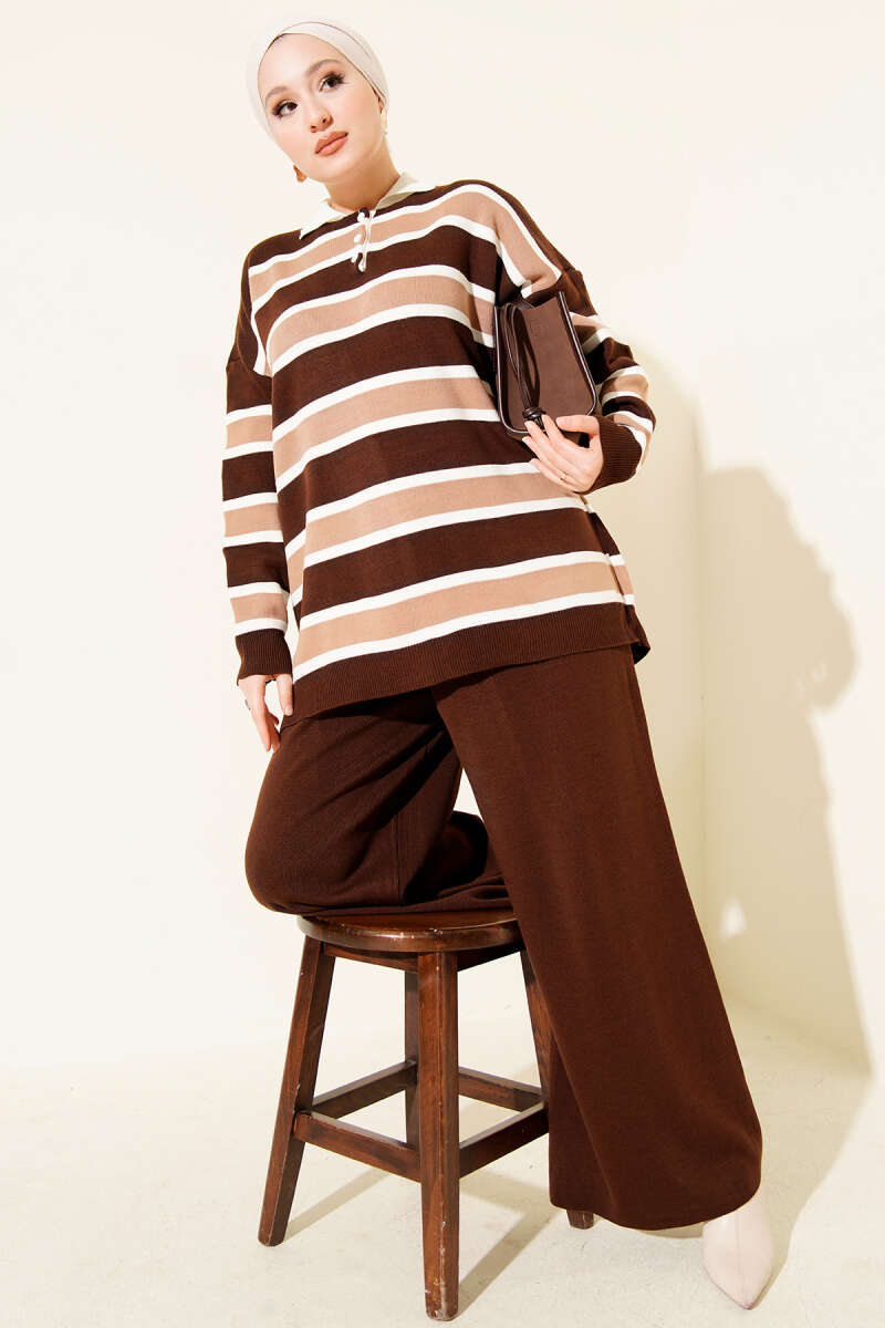 Hemdkragen, gestreifter Strick-Zweiteiler braun