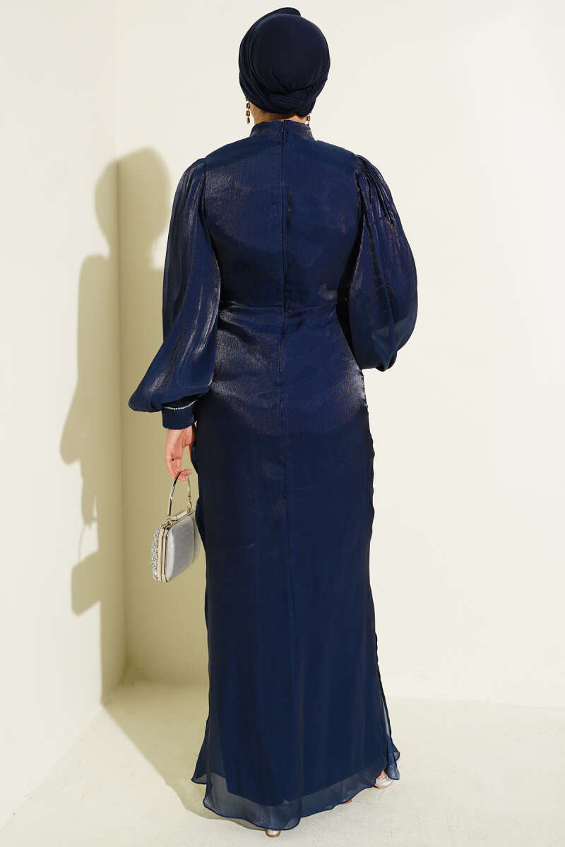 Taşlı Balon Kol Abiye Elbise Lacivert