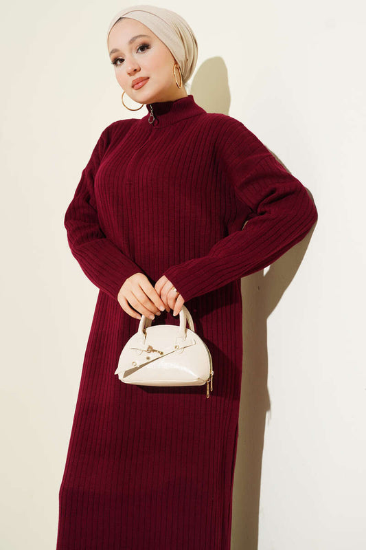 Yarım Fermuarlı Dik Fitilli Triko Elbise bordo