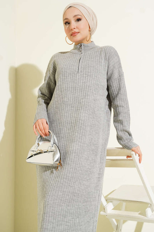 Yarım Fermuarlı Dik Fitilli Triko Elbise gri