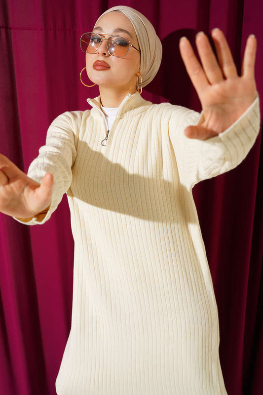Yarım Fermuarlı Dik Fitilli Triko Elbise taş