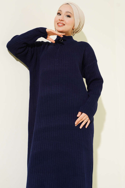 Yarım Fermuarlı Dik Fitilli Triko Elbise Lacivert