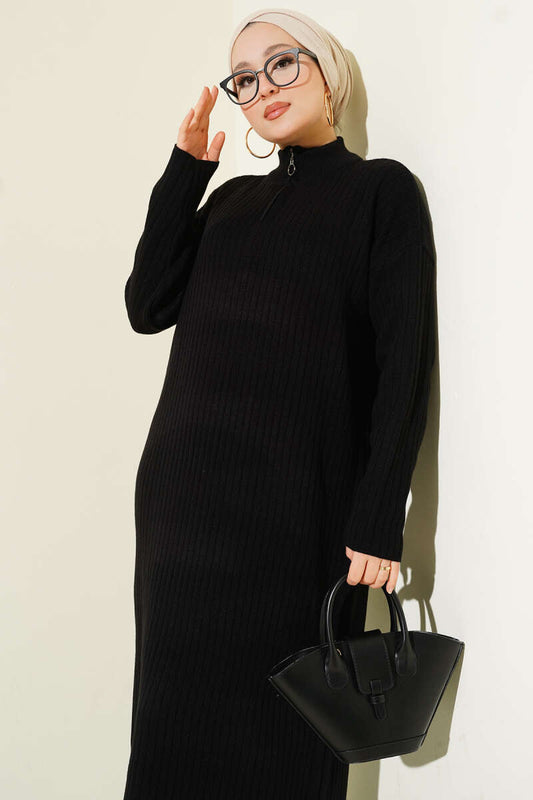 Yarım Fermuarlı Dik Fitilli Triko Elbise siyah