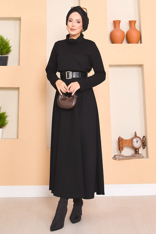 Kapüşonlu Triko Elbise Siyah-Ekru