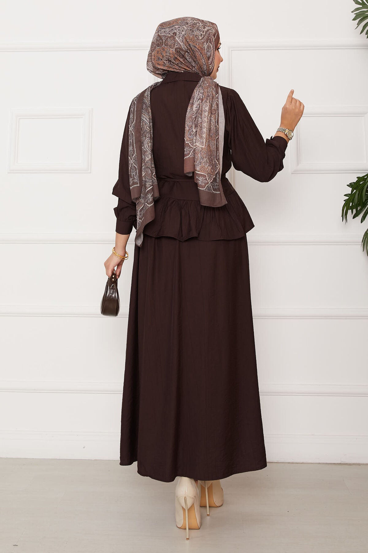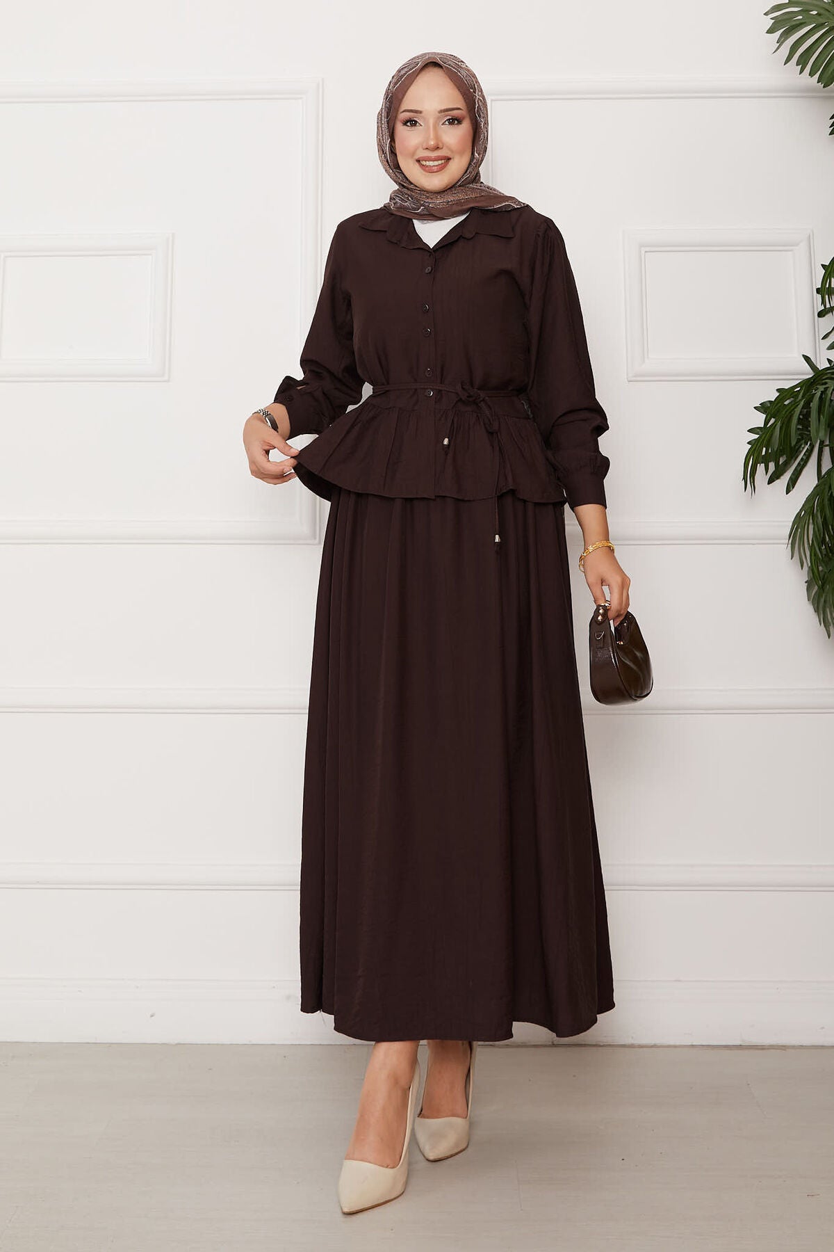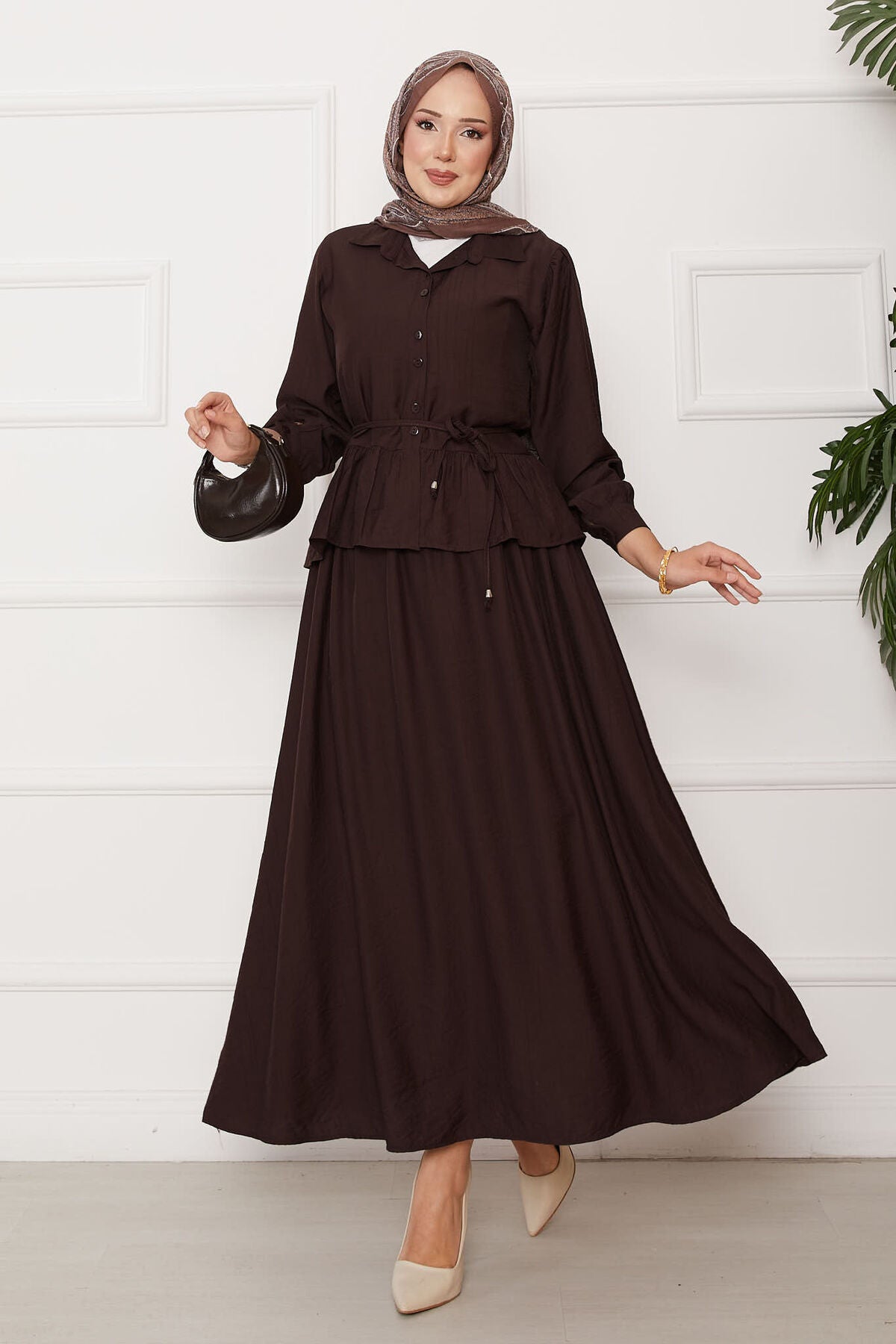 Beli Bağcık Detaylı Etekli İkili Takım kahve