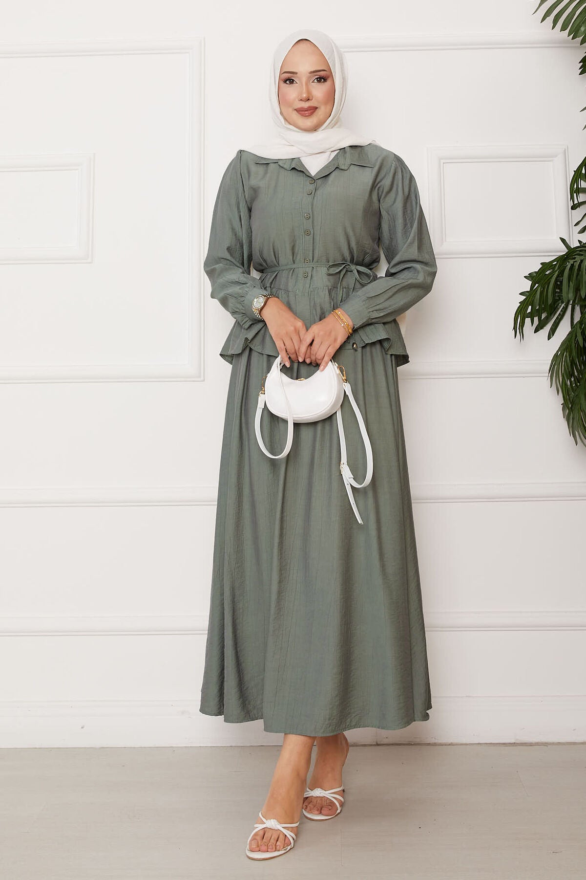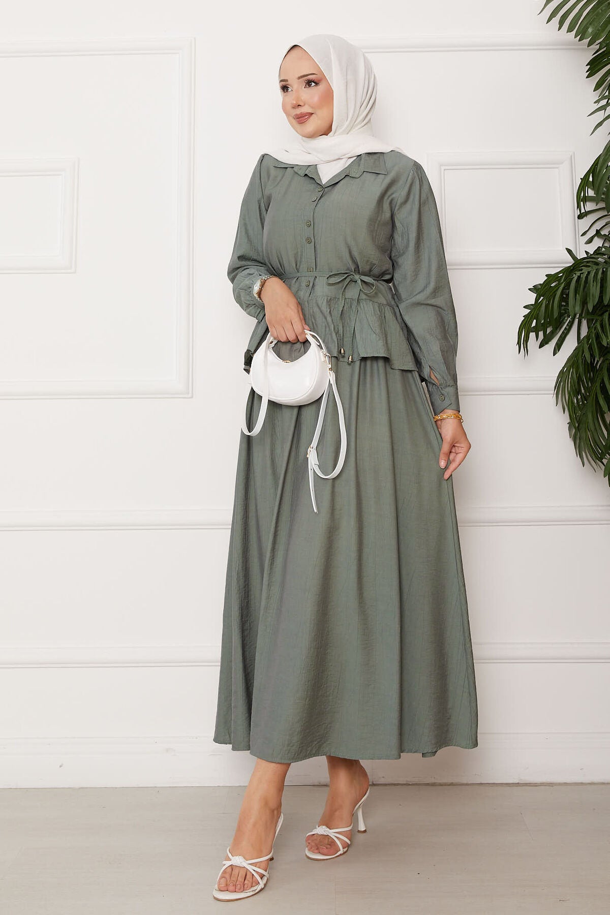 Beli Bağcık Detaylı Etekli İkili Takım Haki