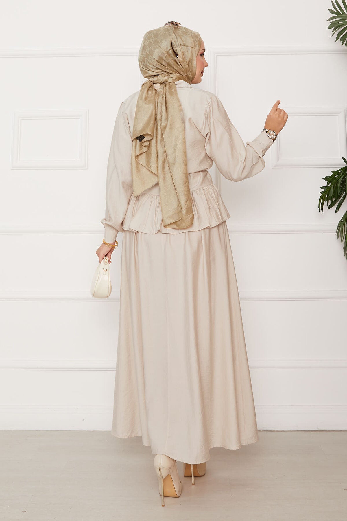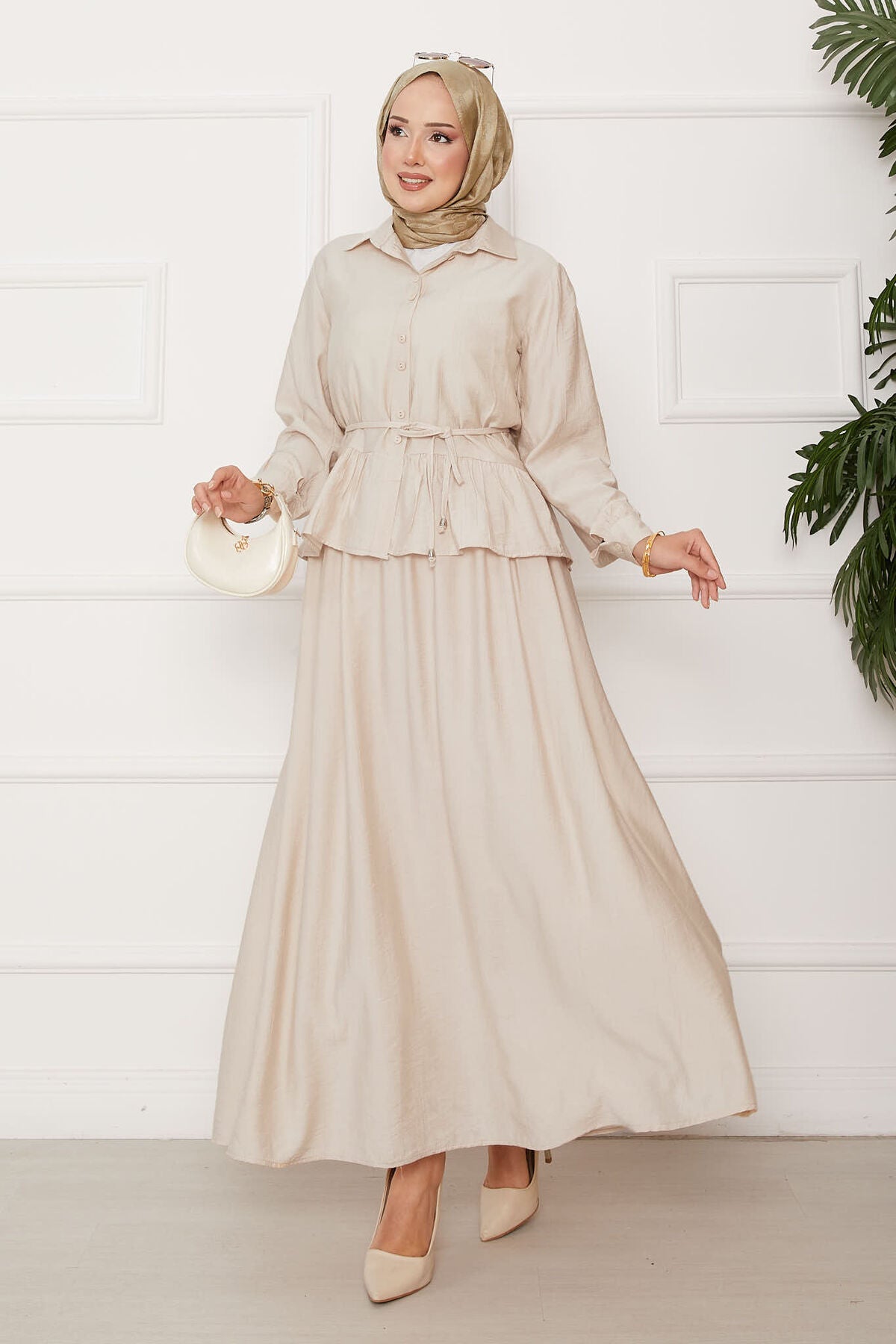 Beli Bağcık Detaylı Etekli İkili Takım krem