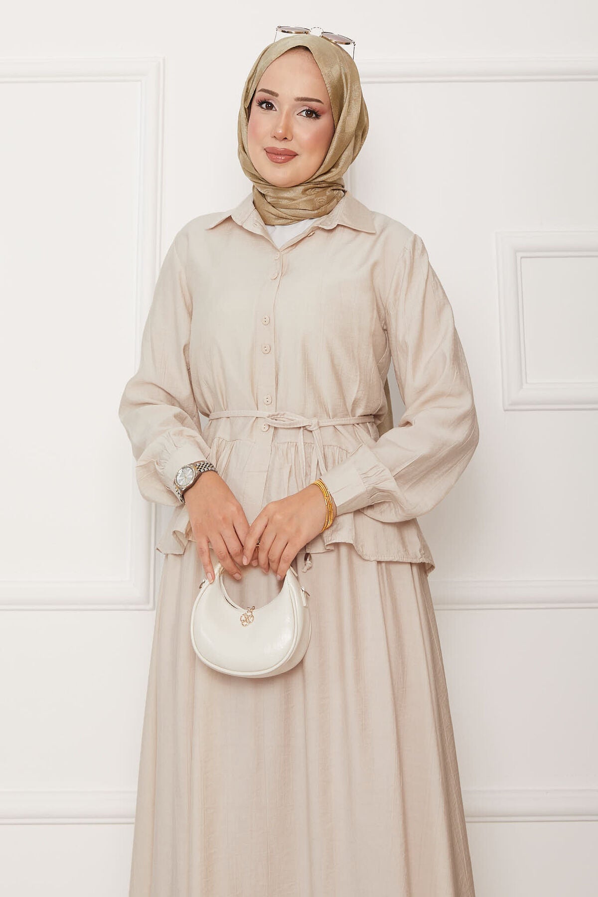 Ürün mevsimliktir. Tunik önden boydan düğmeli belden bağcıklı tunik etek ucu volanlı etek belden lastikli iç göstermez