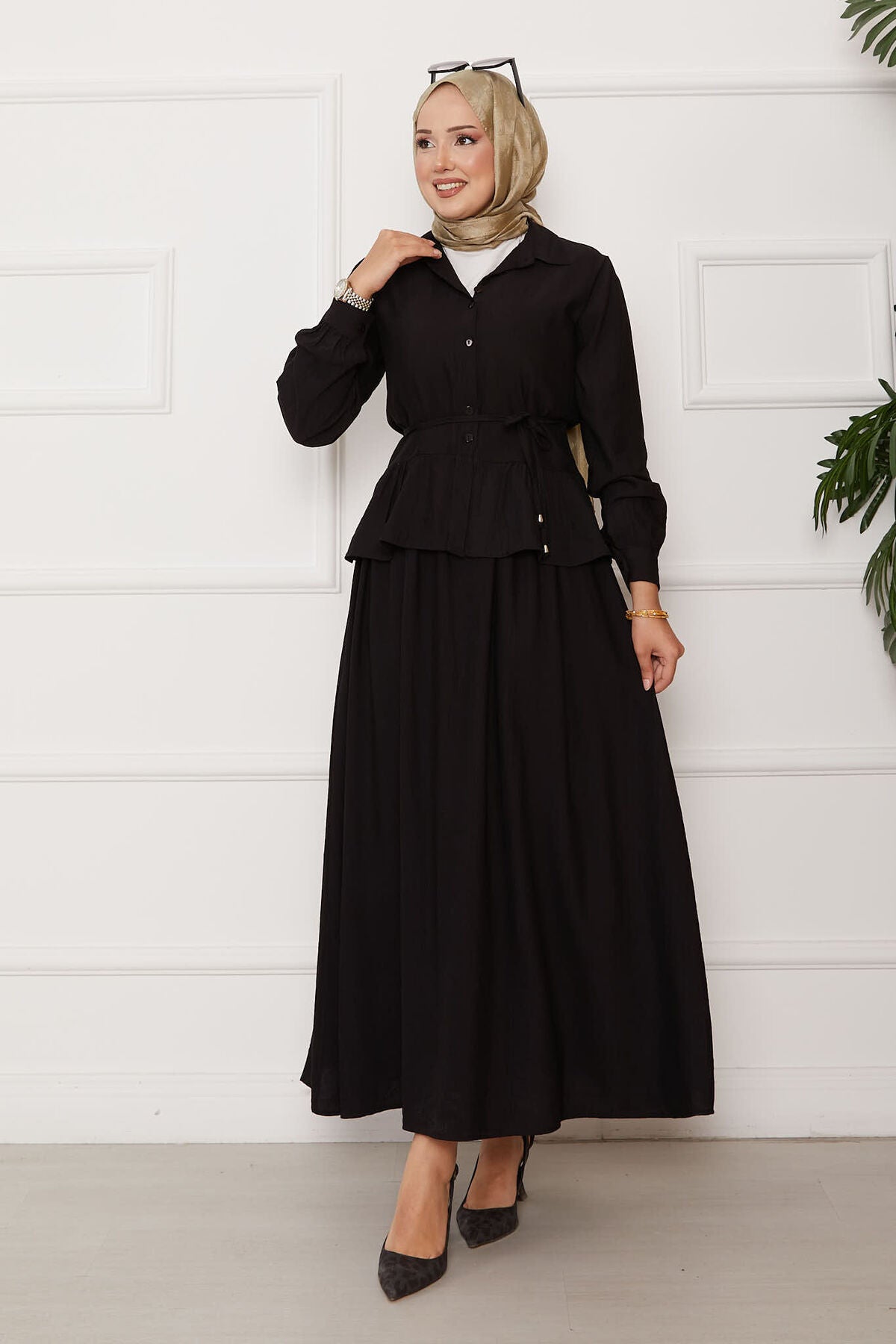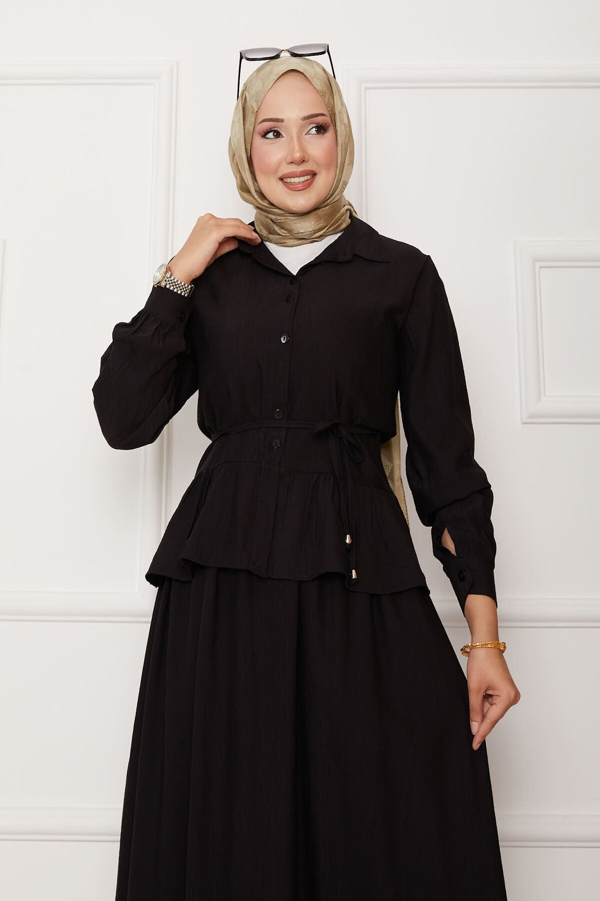 Beli Bağcık Detaylı Etekli İkili Takım Siyah