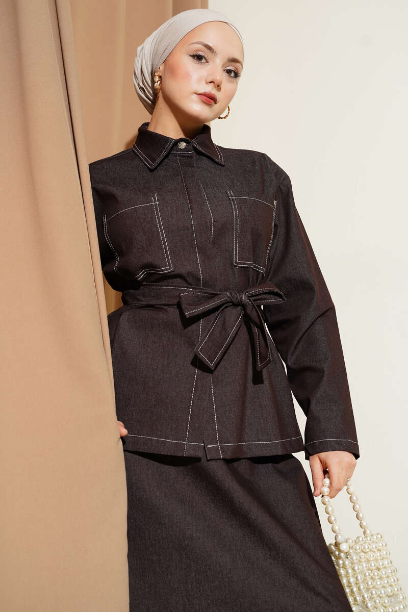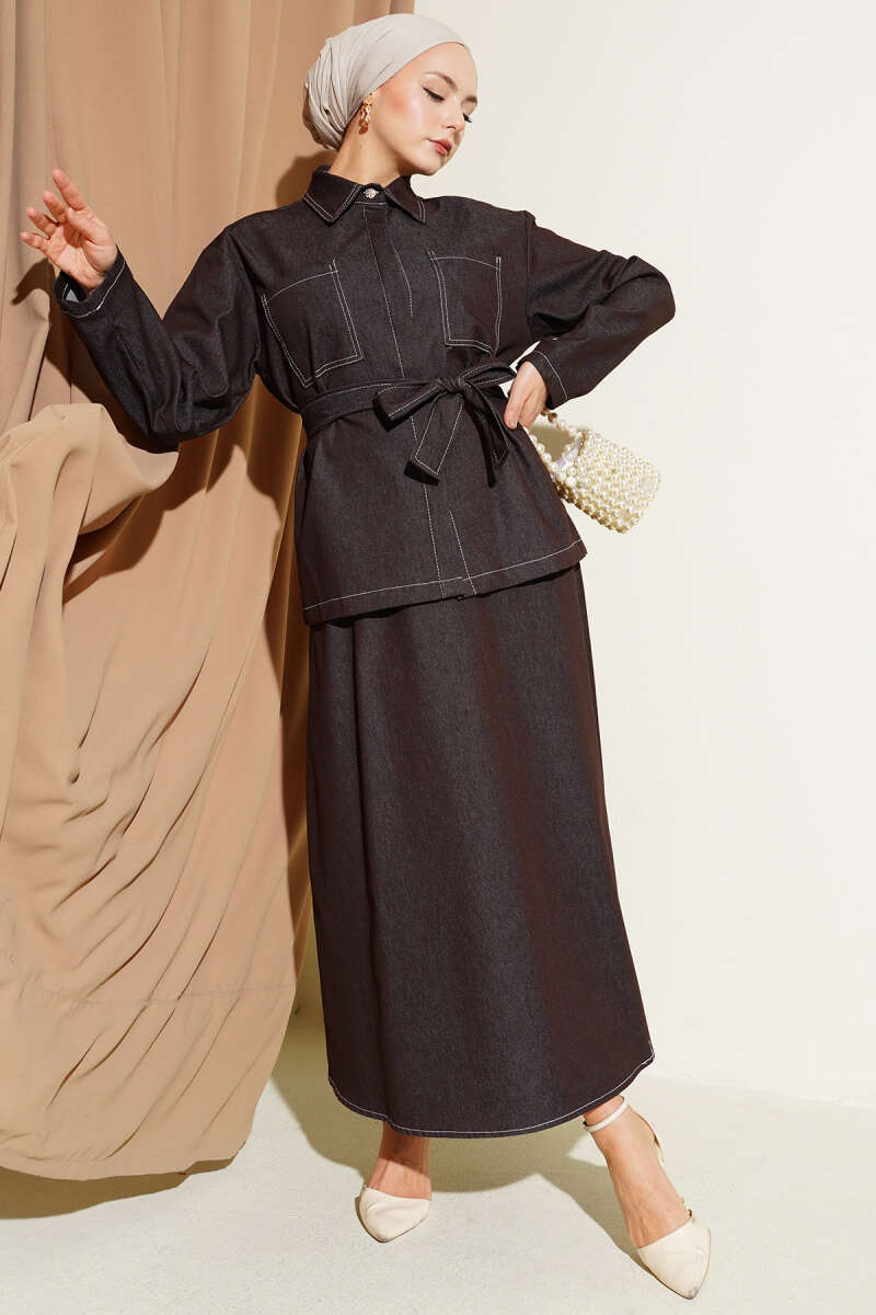 Çift Cepli Kuşaklı Etekli Kot İkili Takım kahverengi