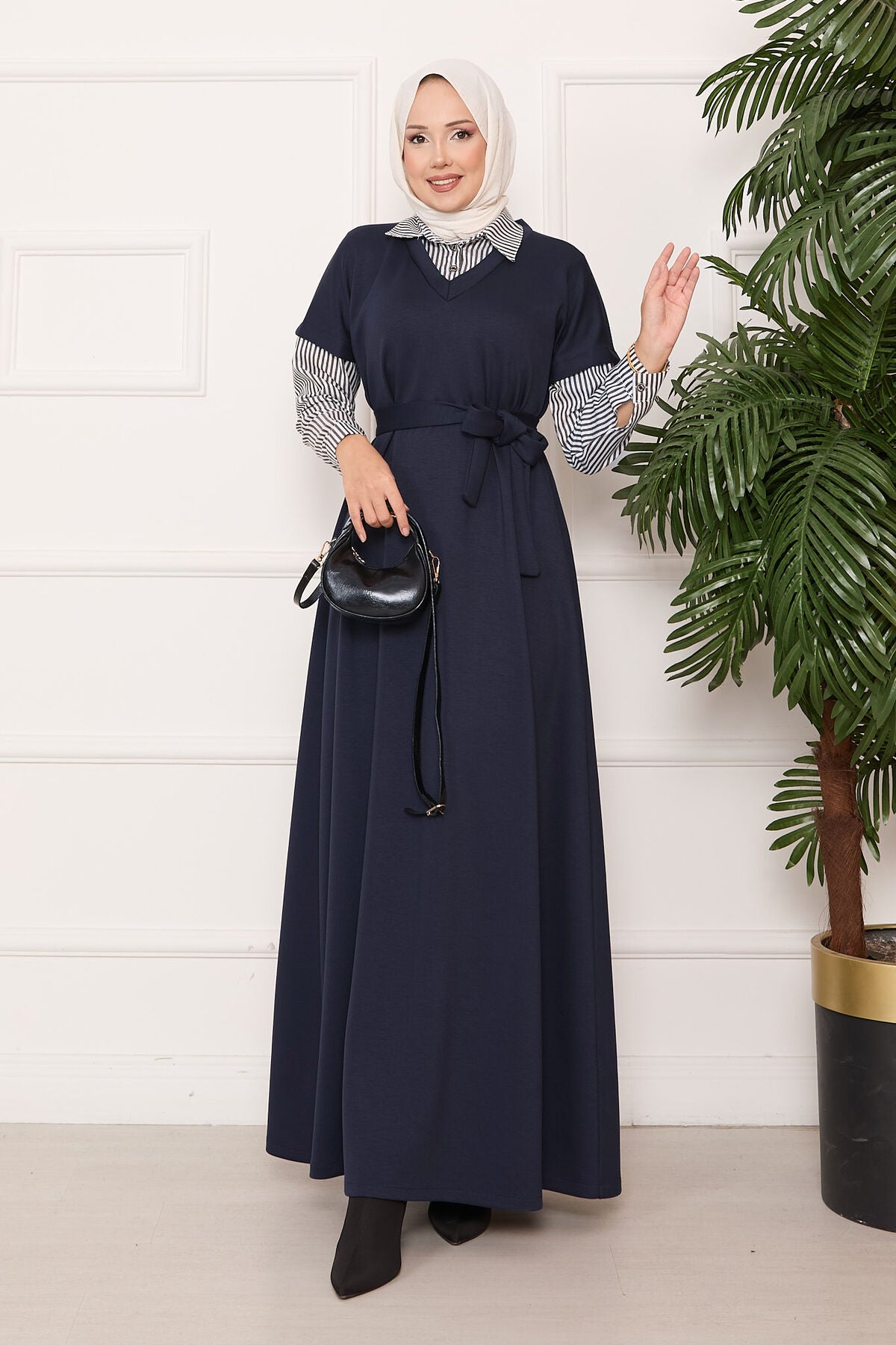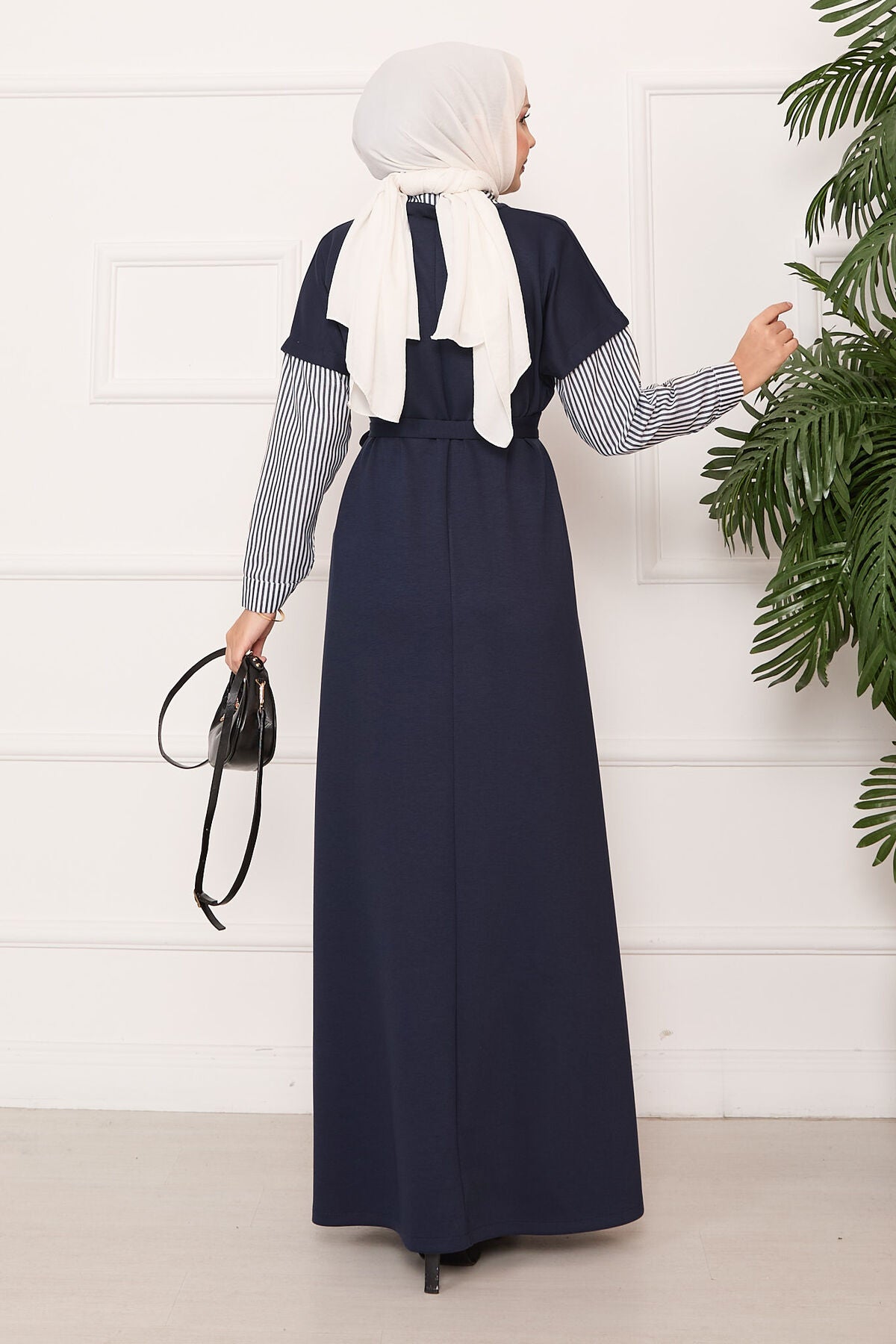 Ürün mevsimliktir. Kolu ve yakası çizgili seyyar kuşaklı tessettür elbise.Kol manşetlerinde düğme detayı vardır.