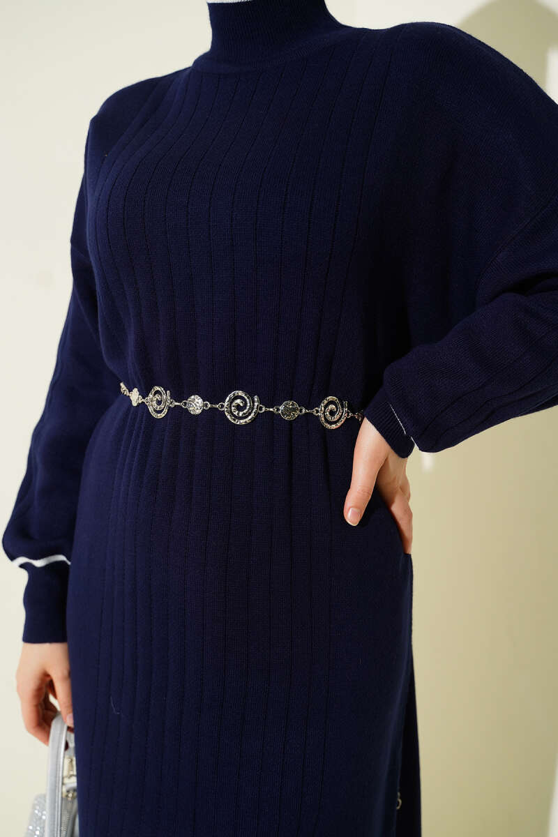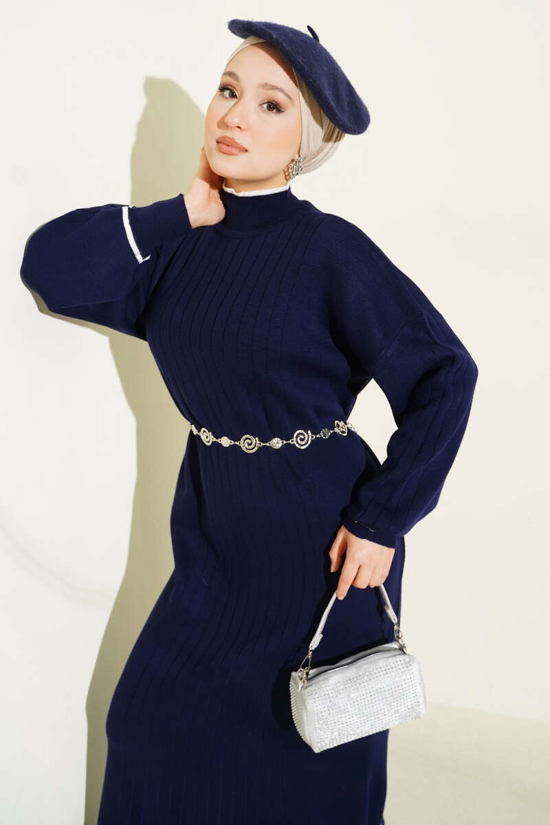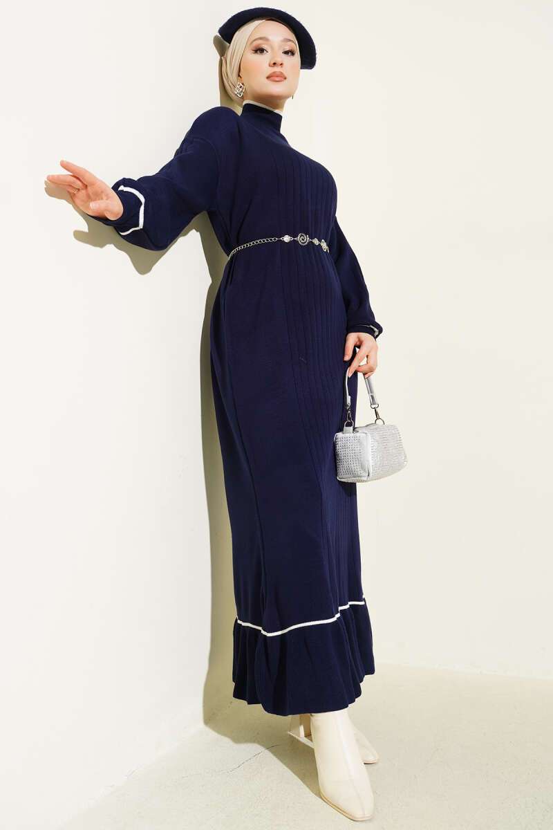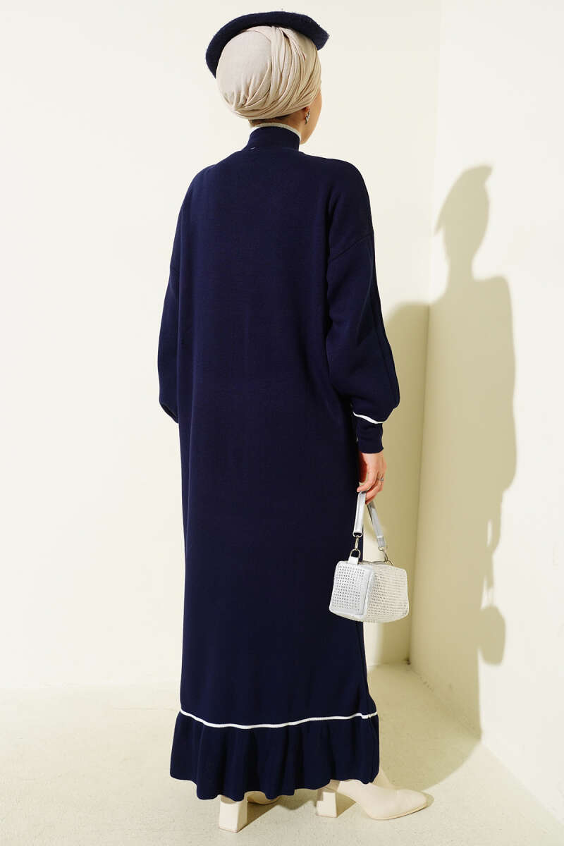 Etek Ucu Fırfır Detaylı Triko Elbise Lacivert