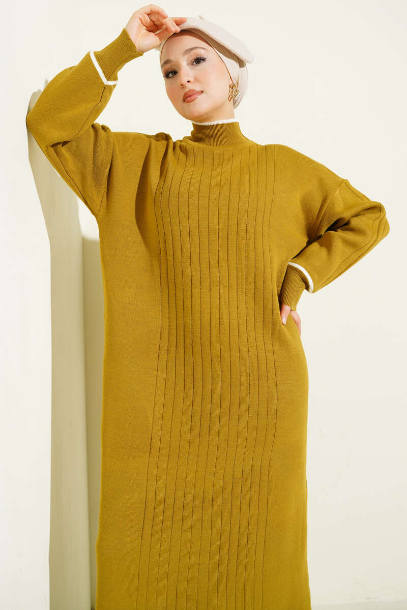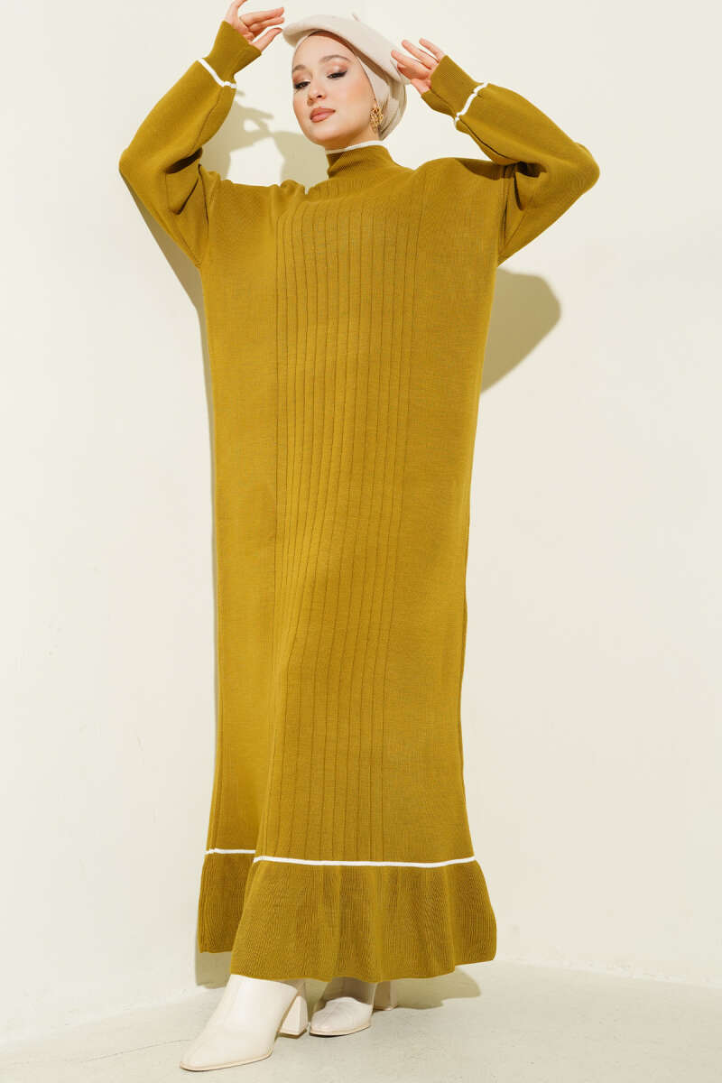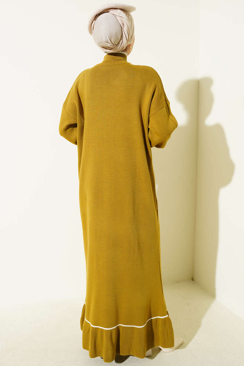 Etek Ucu Fırfır Detaylı Triko Elbise yağ yeşili