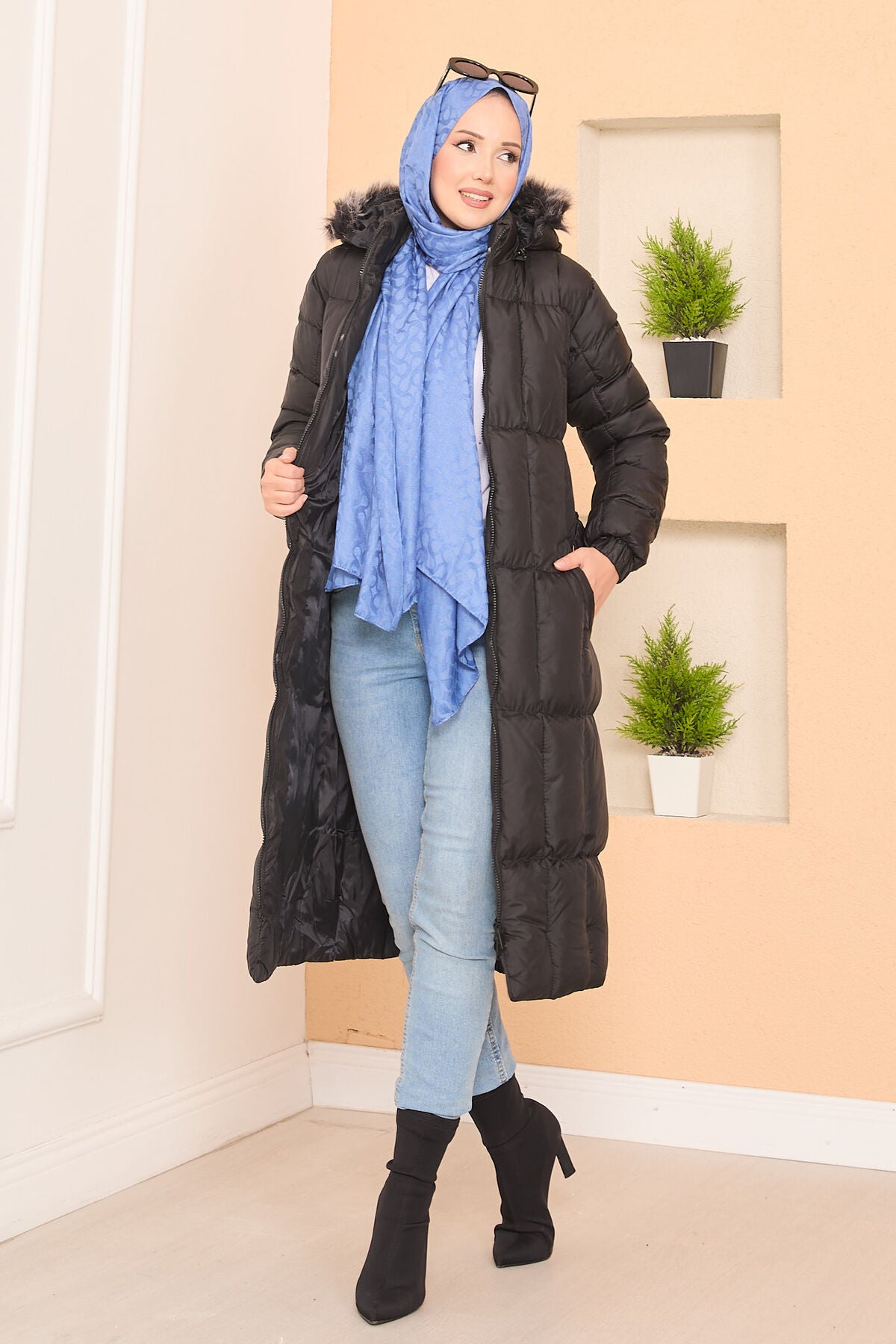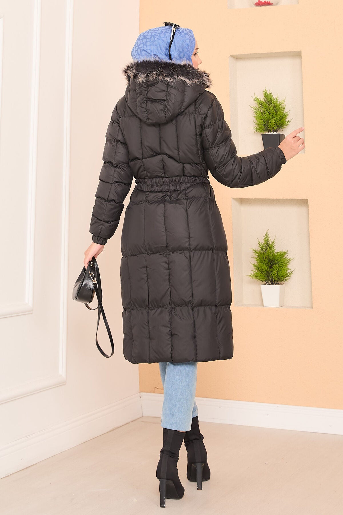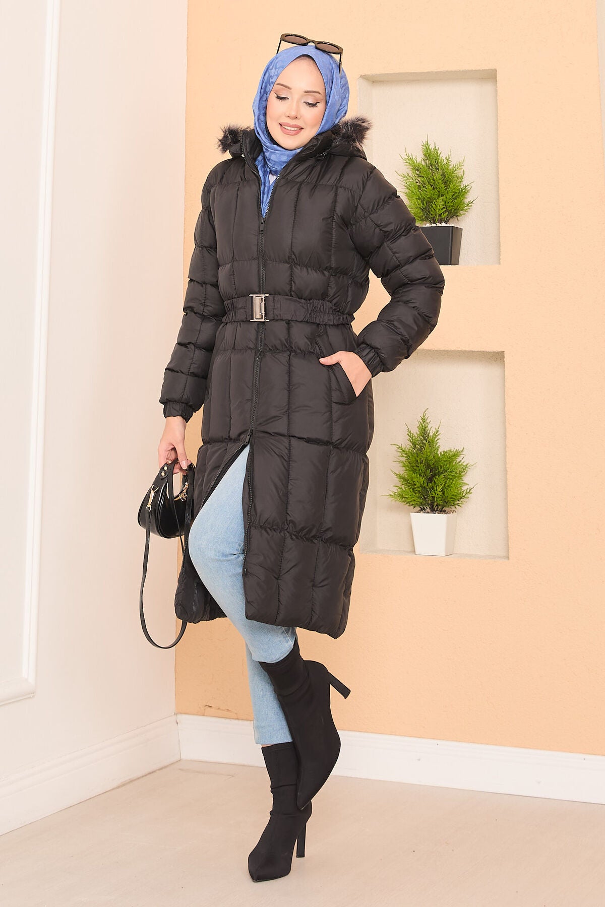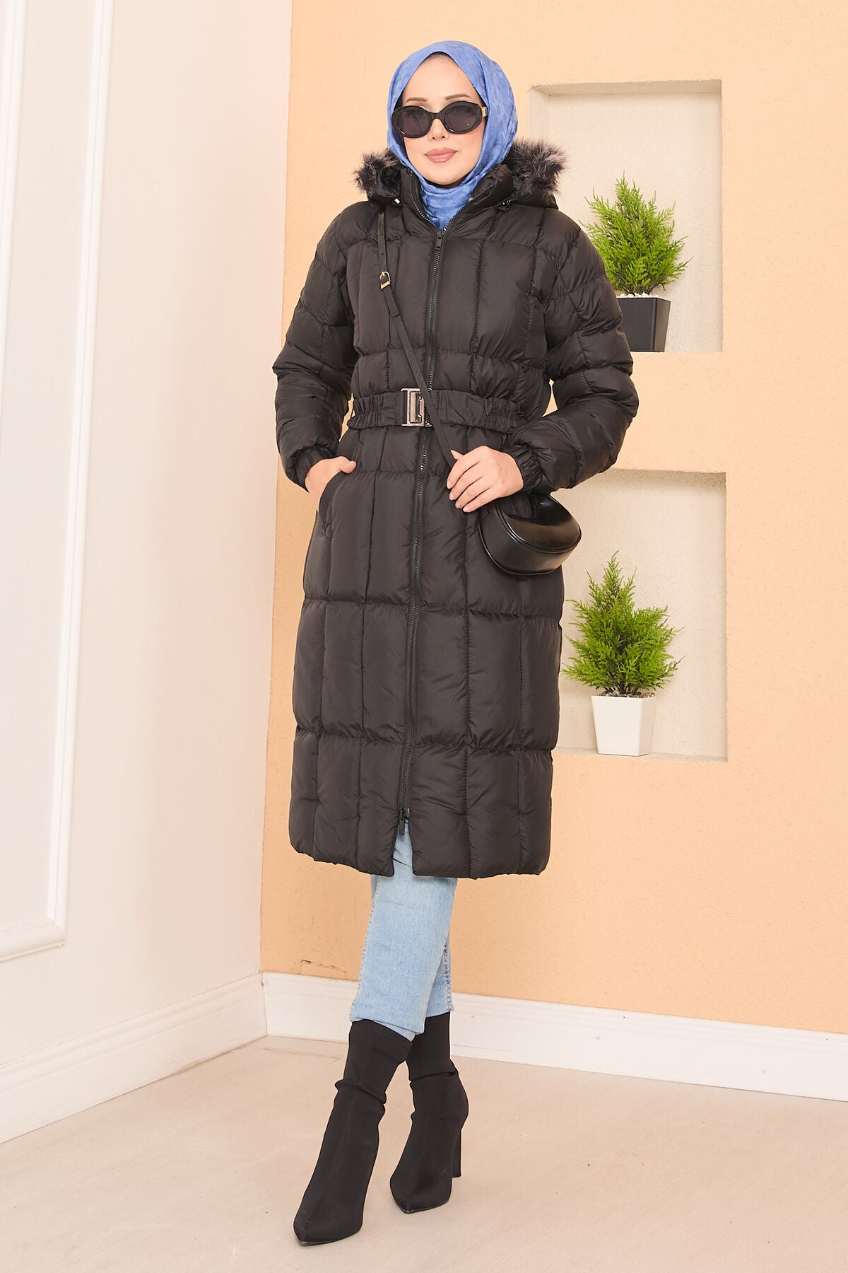 Kapüşonu Kürklü ,Kemerli Şişme Mont siyah