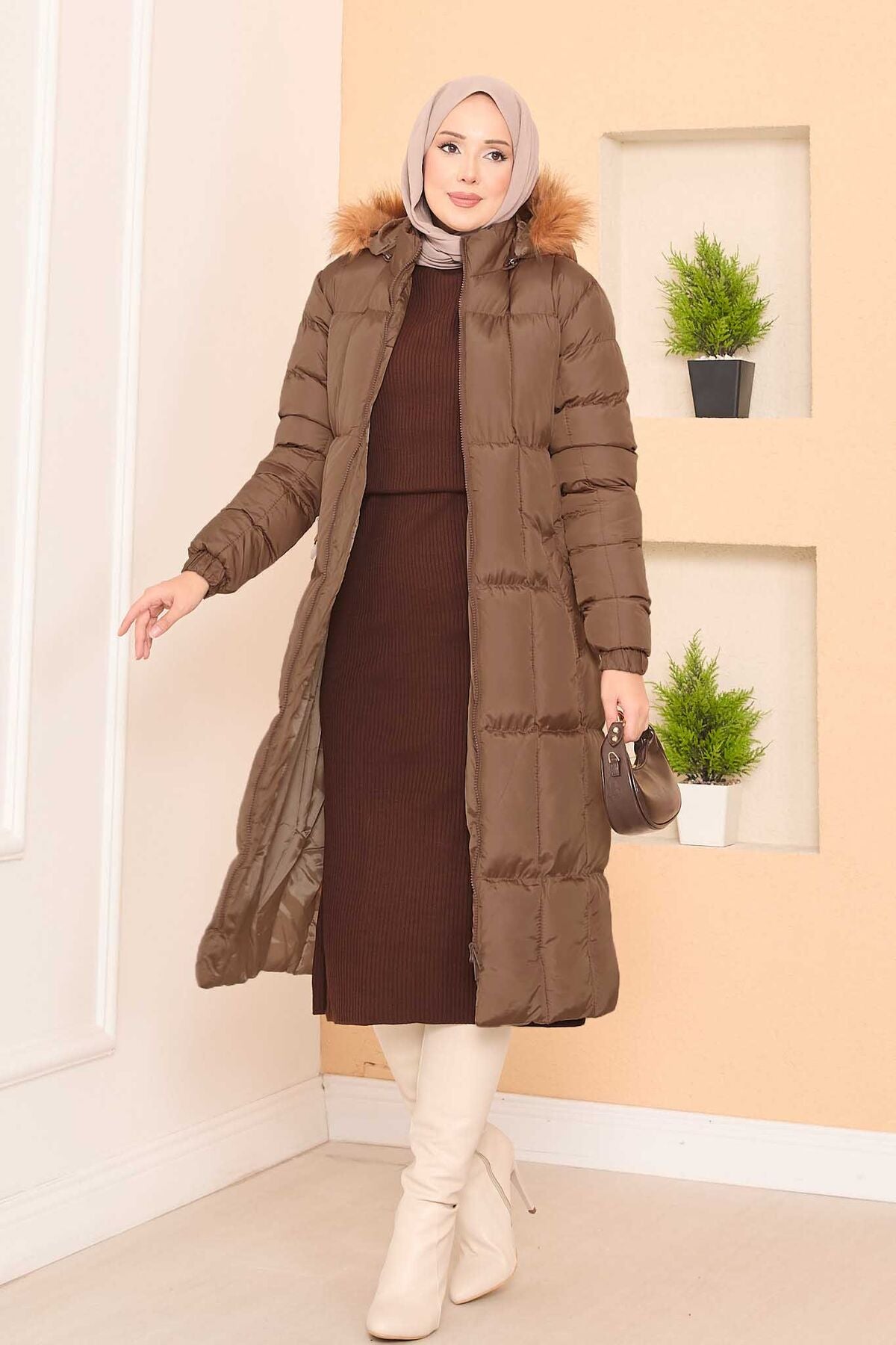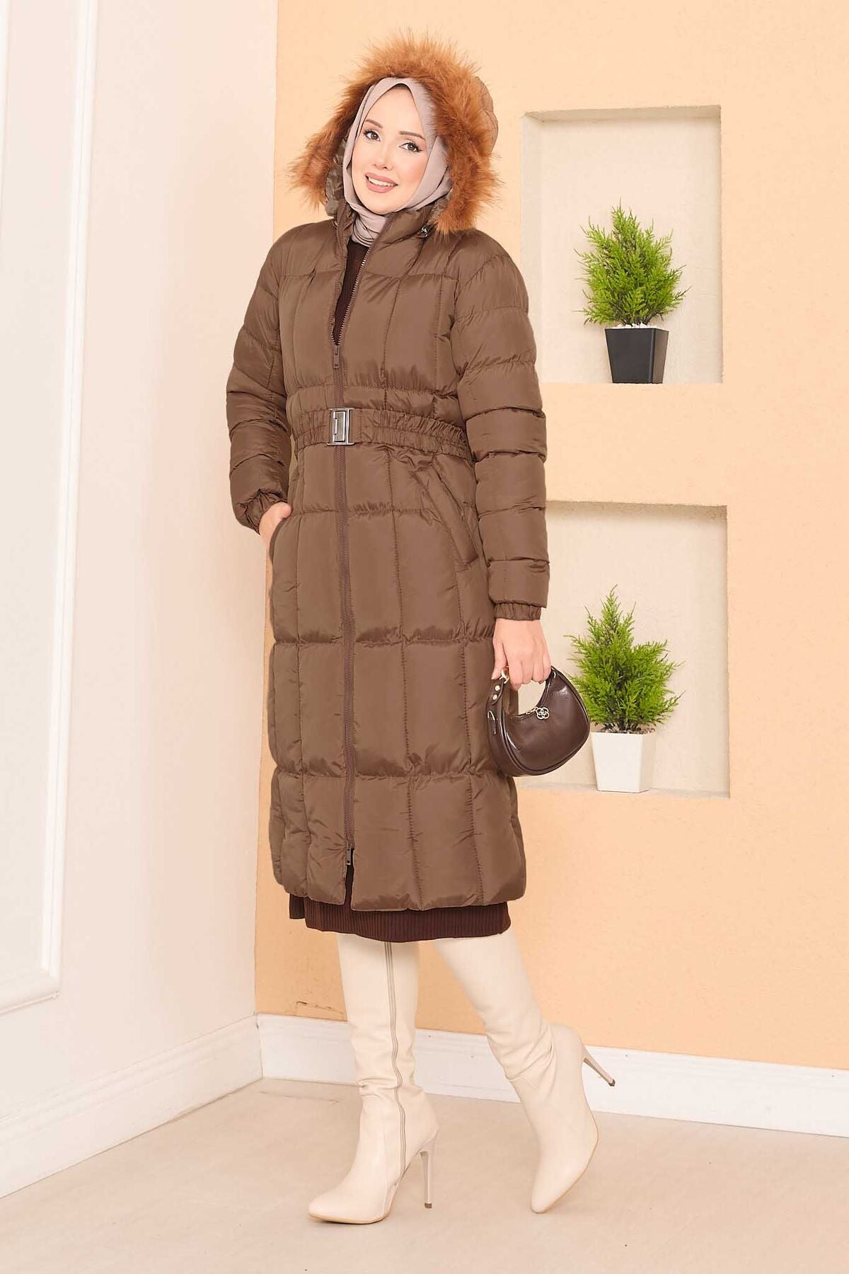 Kapüşonu Kürklü Kemerli Şişme Mont kahve