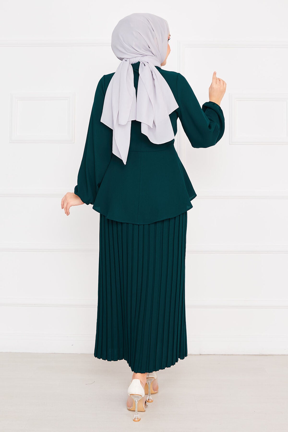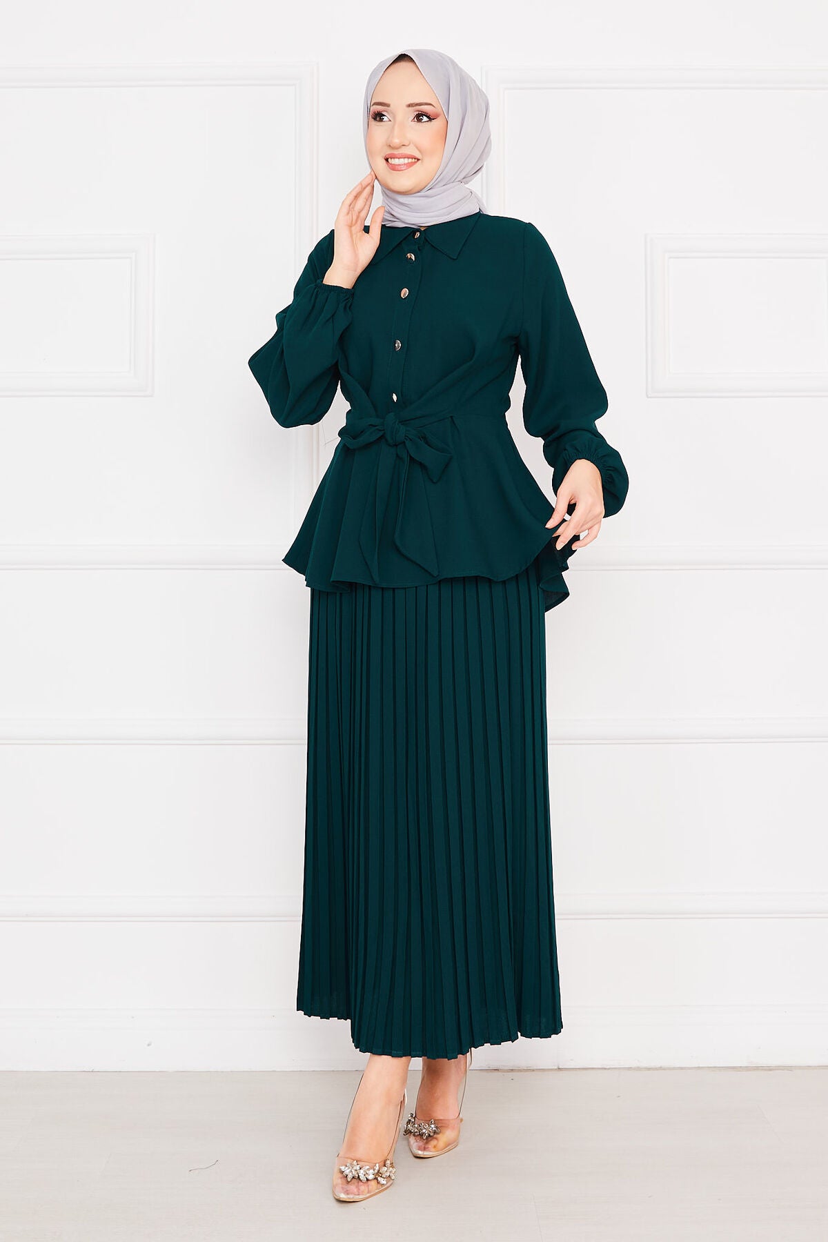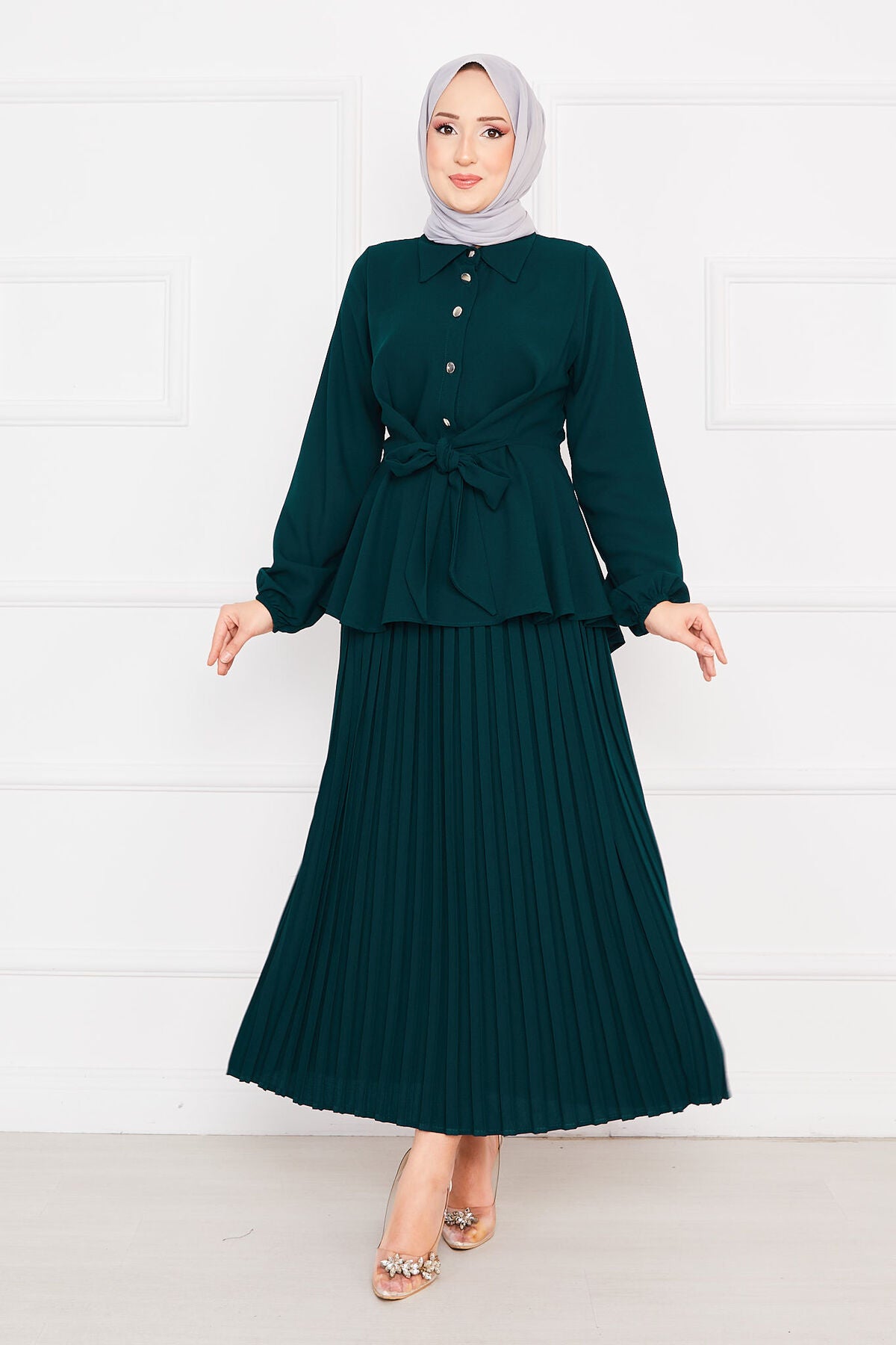 Kendinden Kuşaklı Pileli Takım Zümrüt yeşili