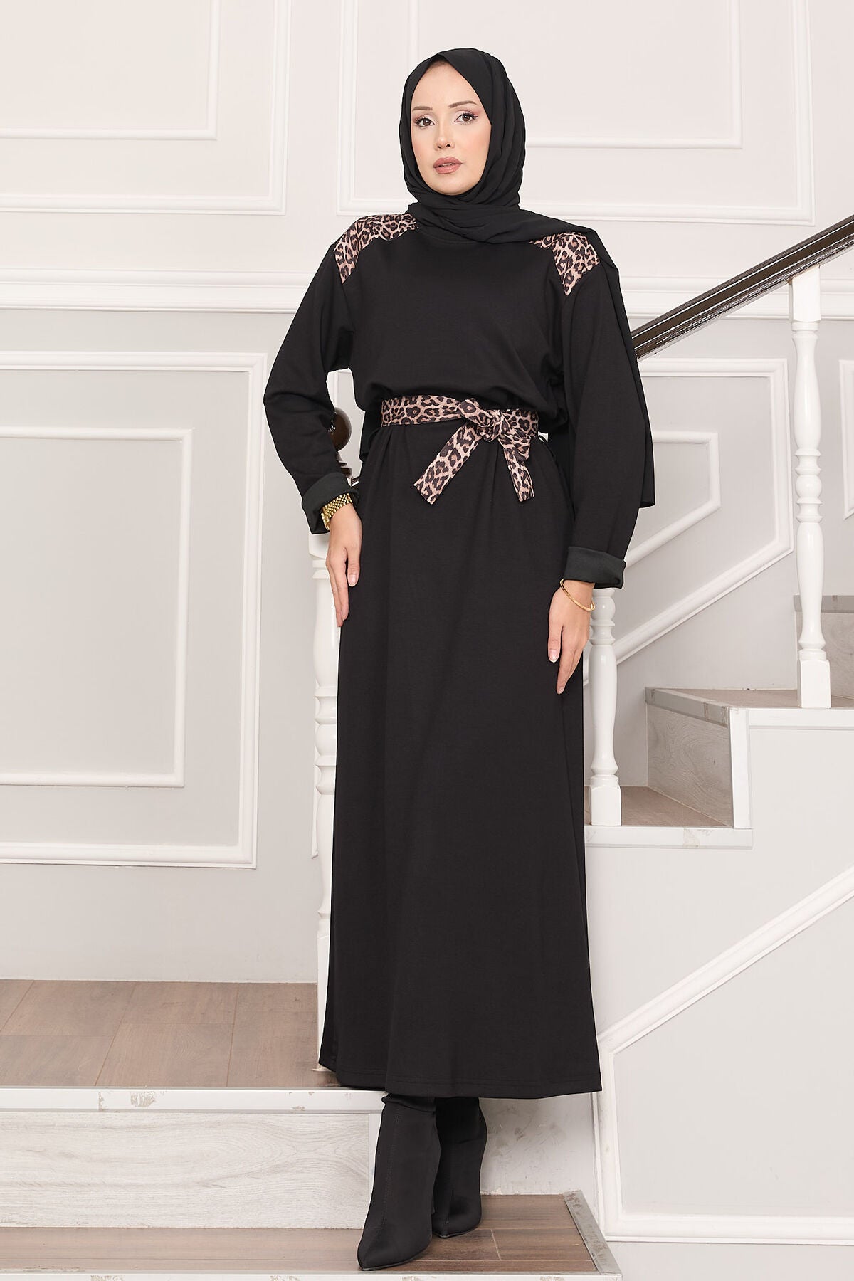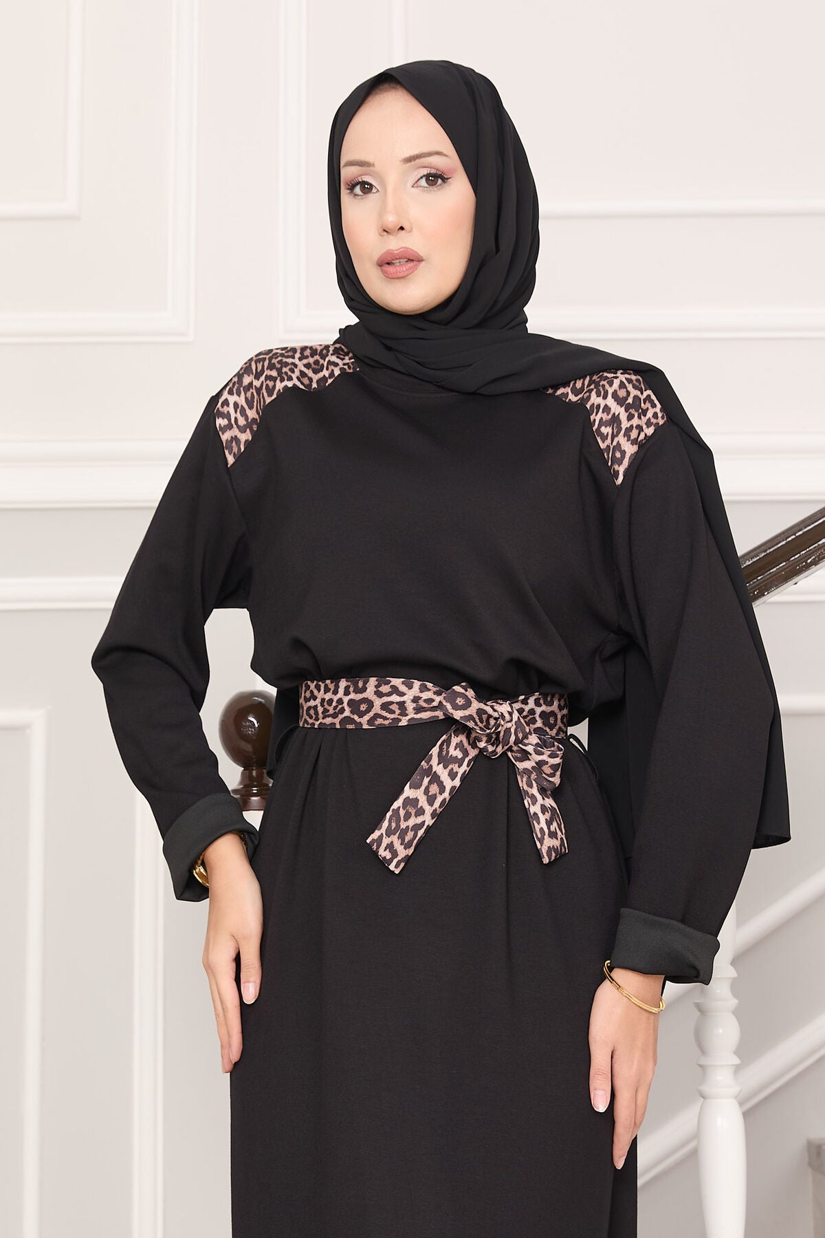 Leopar Garnili Kuşaklı Oyşo Elbise siyah