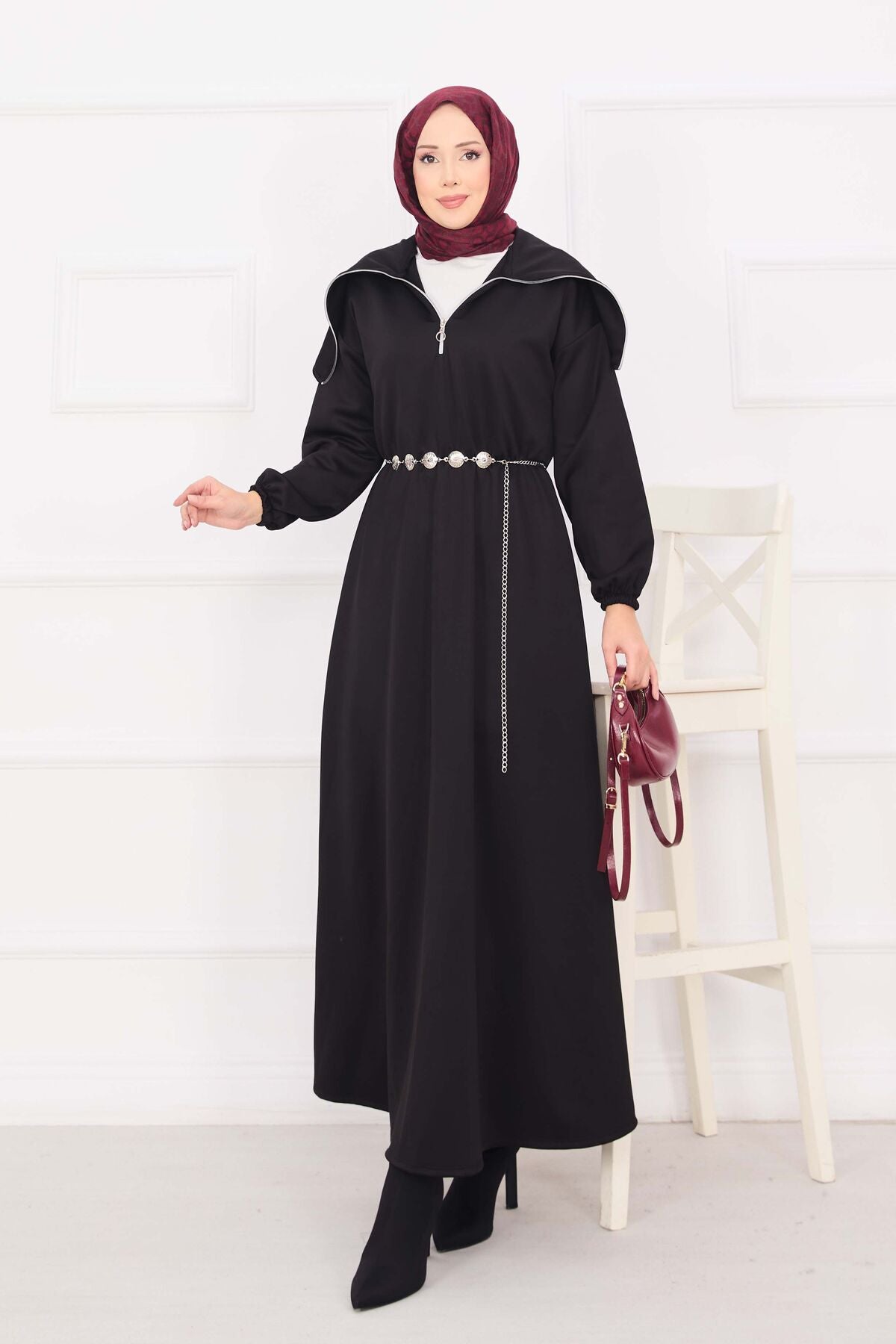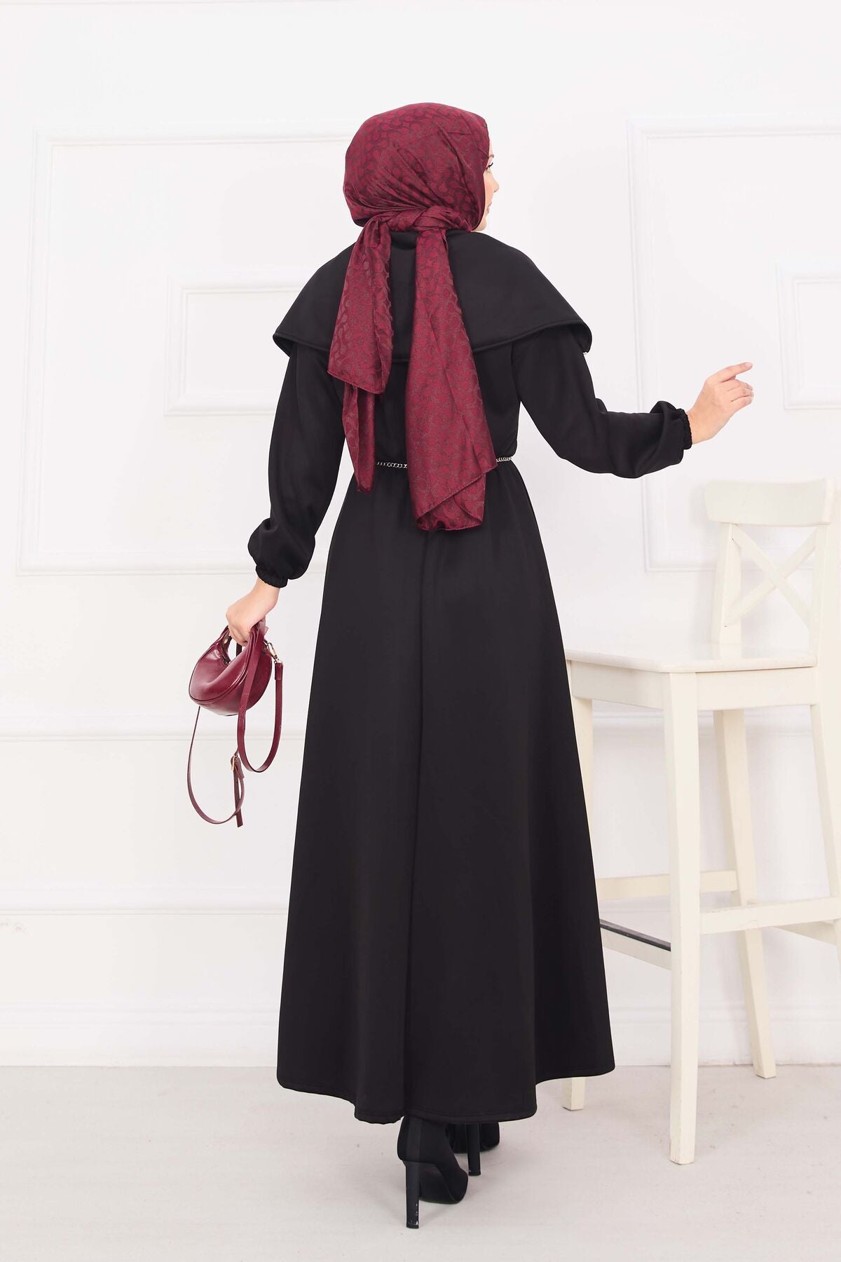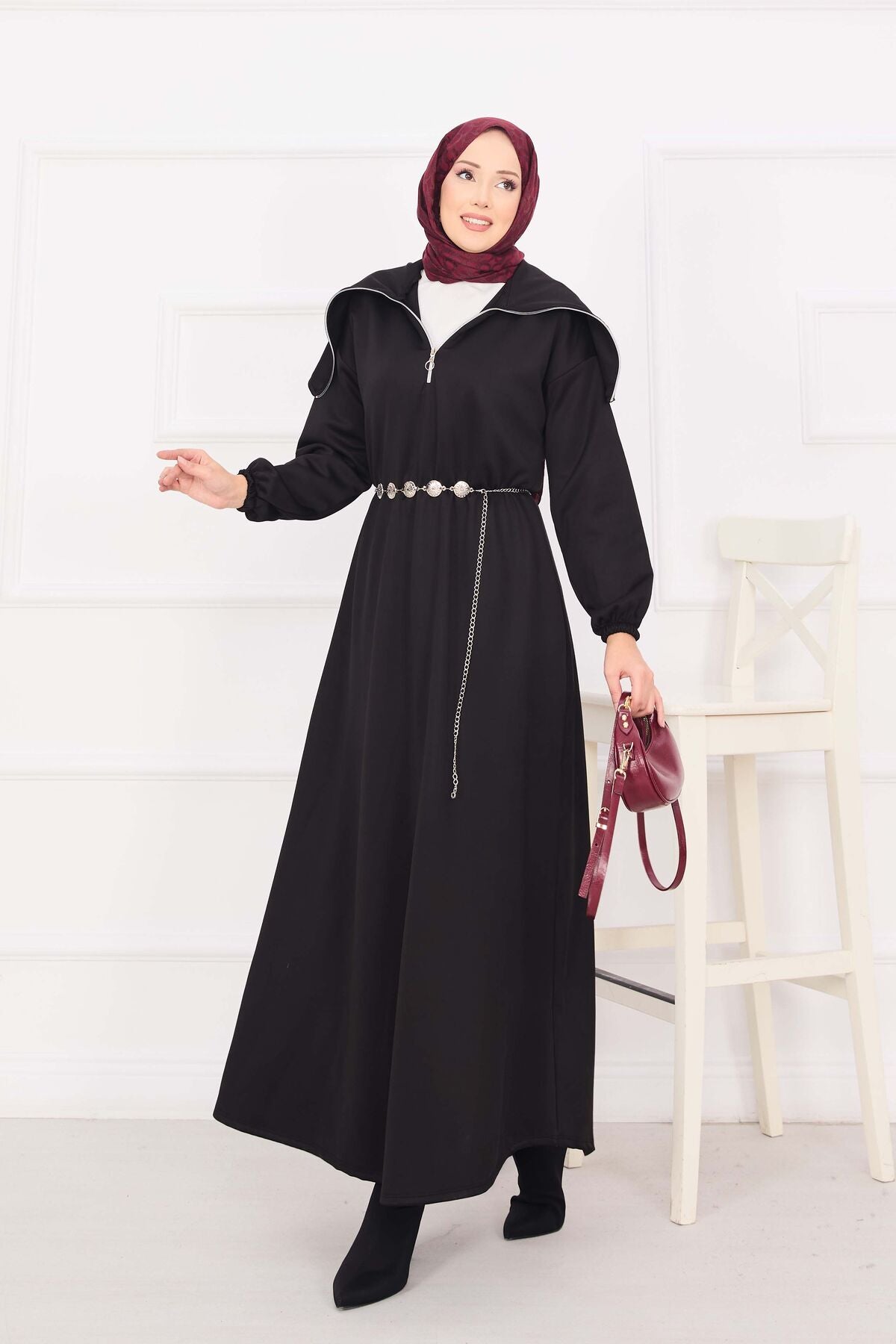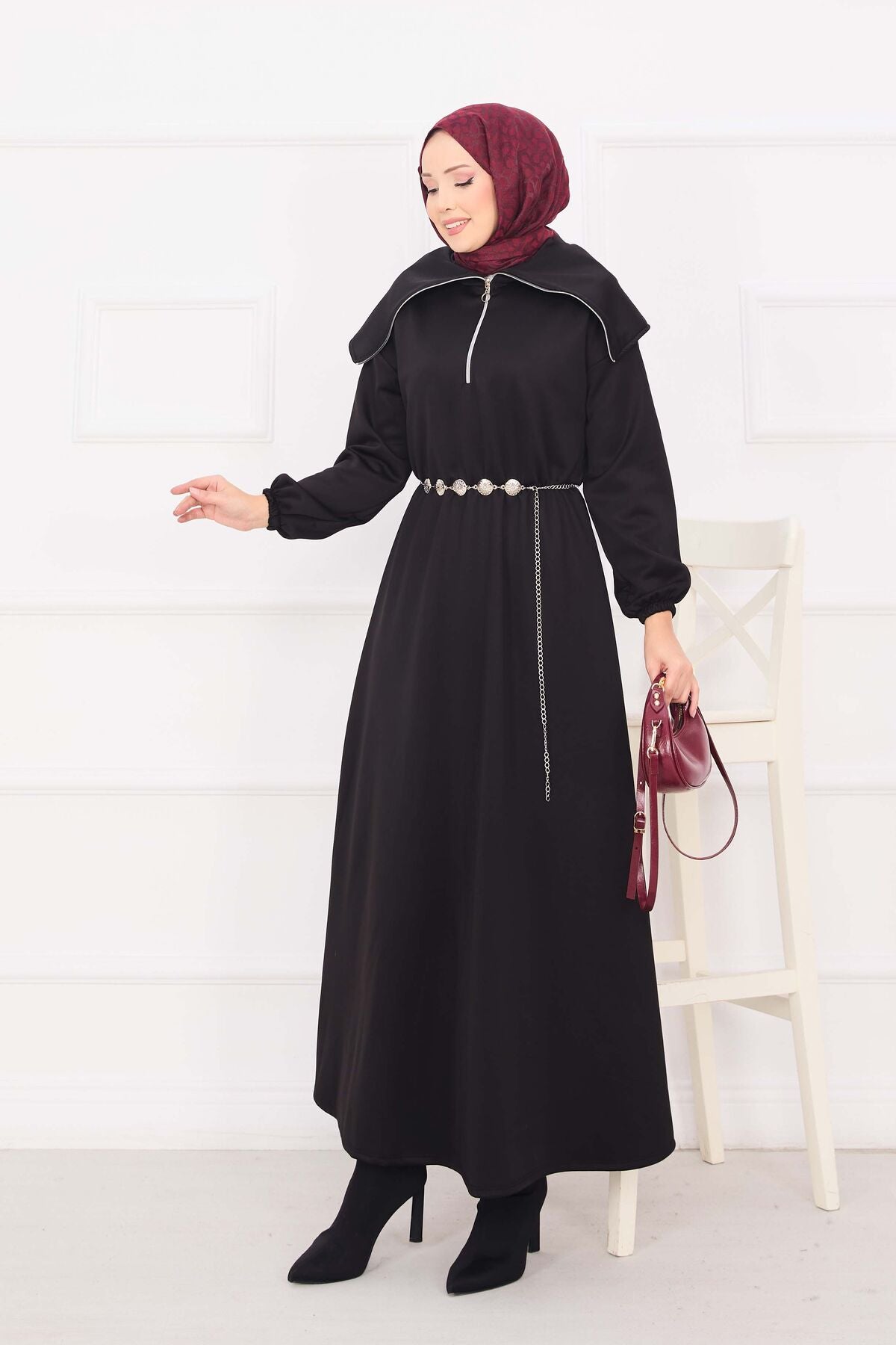 Şal Yaka Zincir Kemerli Tesettür Elbise siyah