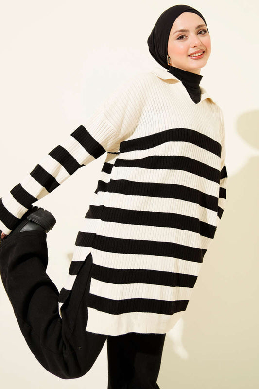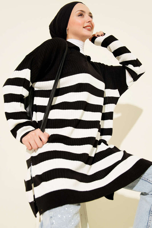 V Yaka Fitilli Çizgili Triko Tunik siyah