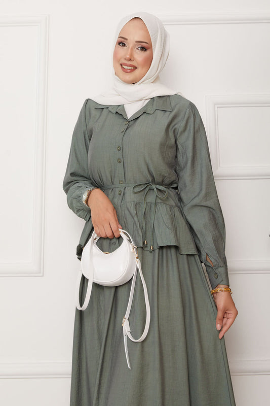 Beli Bağcık Detaylı Etekli İkili Takım Haki