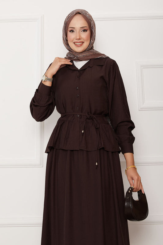 Beli Bağcık Detaylı Etekli İkili Takım kahve