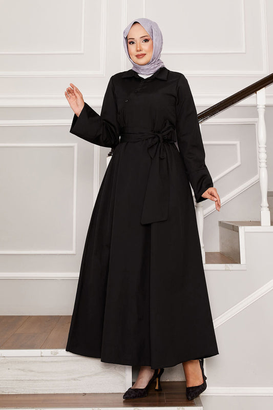 Seyyar Kuşaklı Gömlek Yaka Elbise Siyah